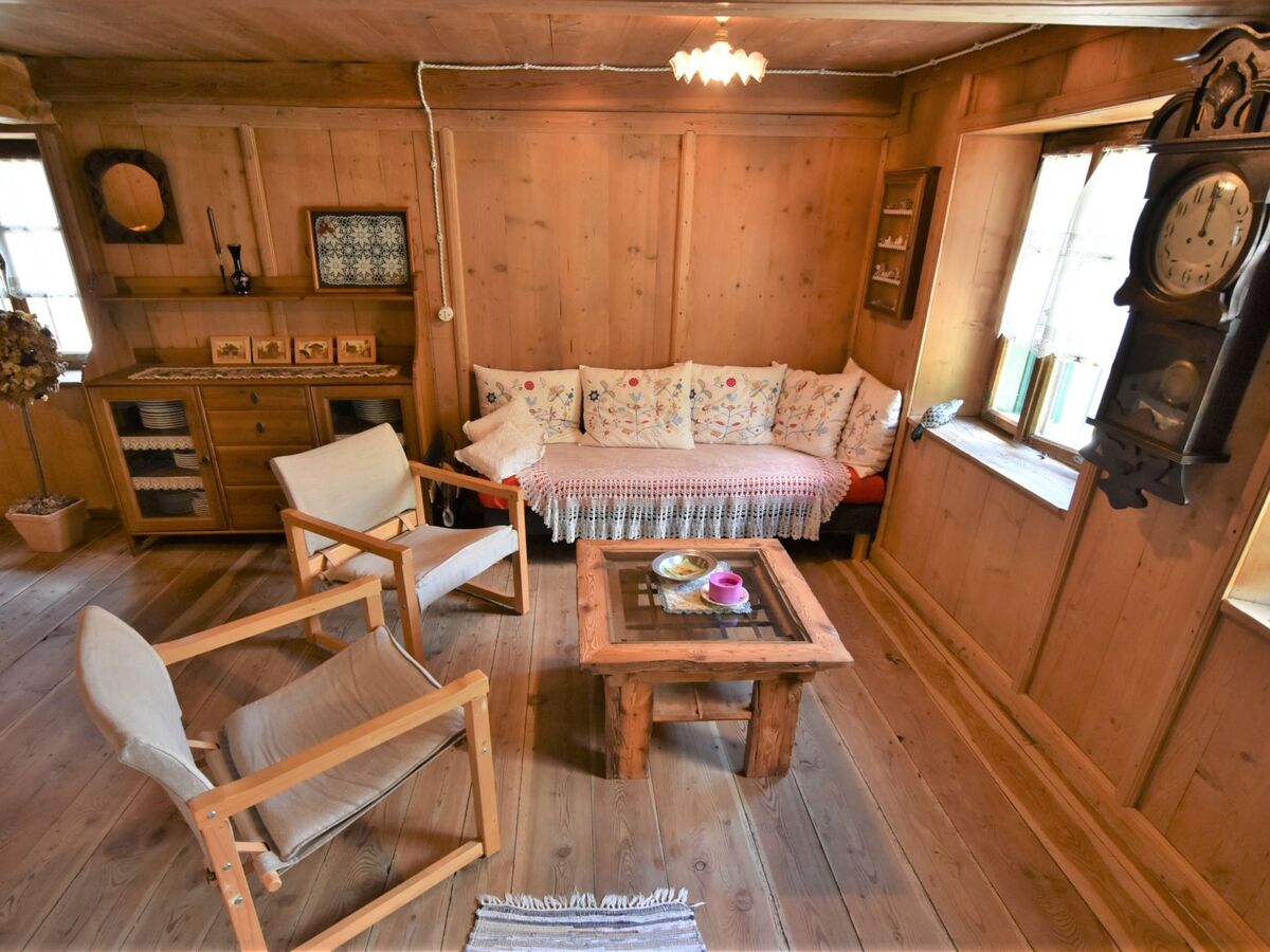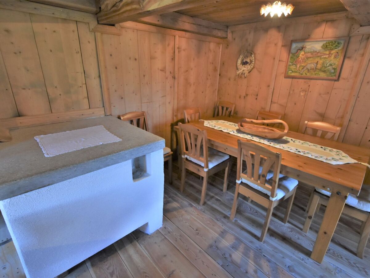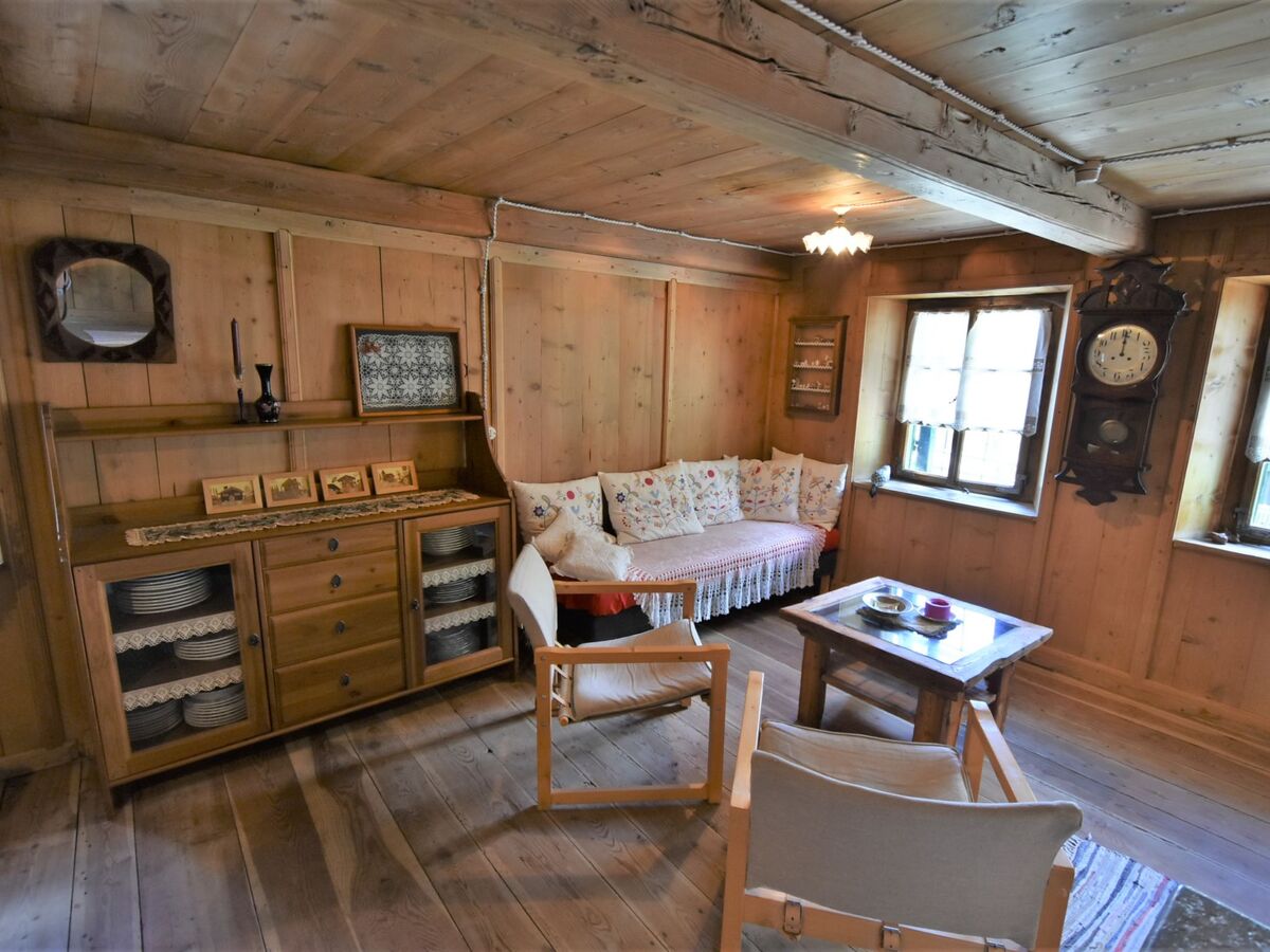 Partiellement mansardée, rénovée en 2021, aménagement rustique et avec beaucoup de bois: séjour/salle à manger hauteur plafond 190 - 205 cm avec table pour les repas et TV (écran plat), radio et poêle à bois.