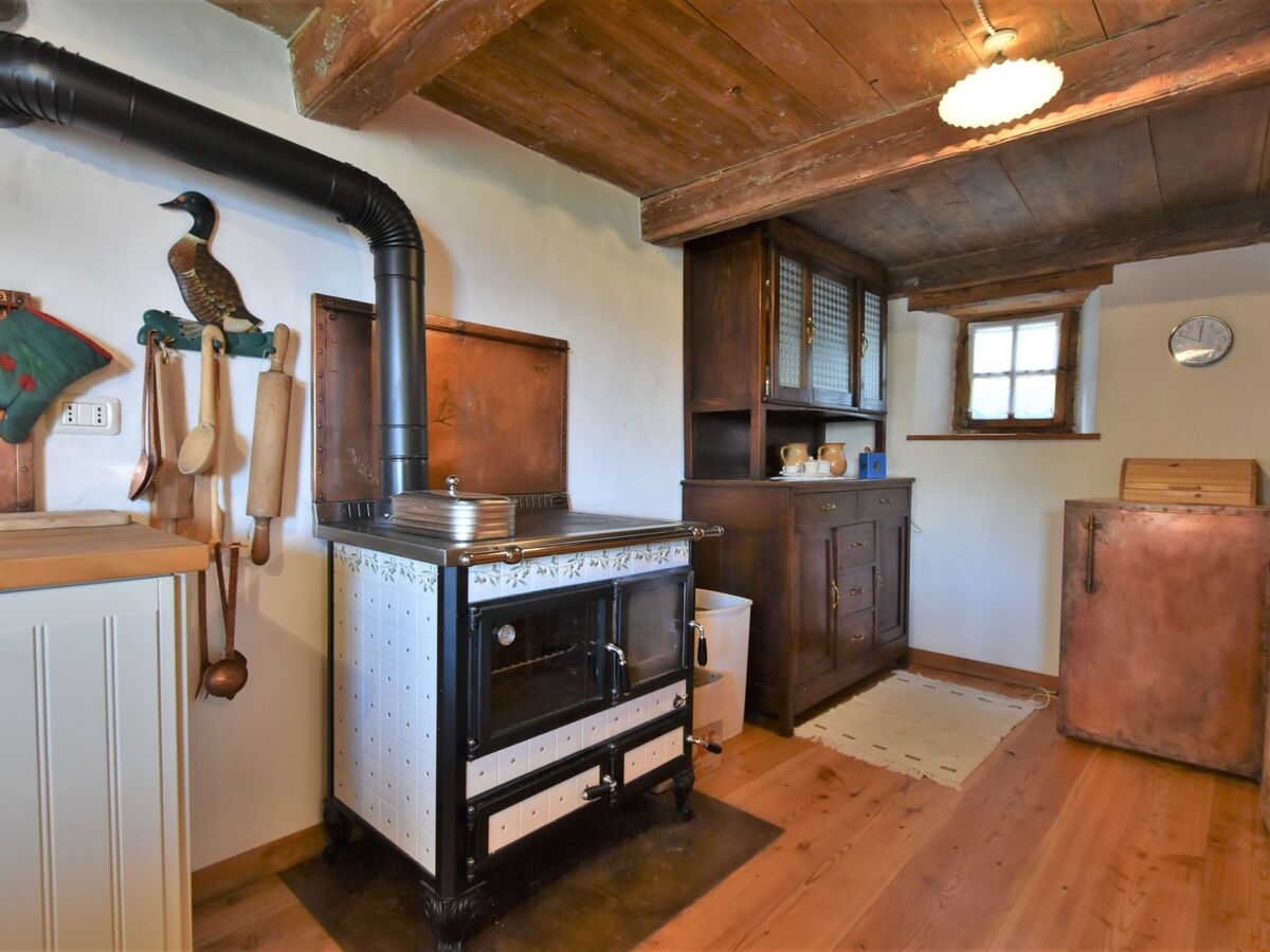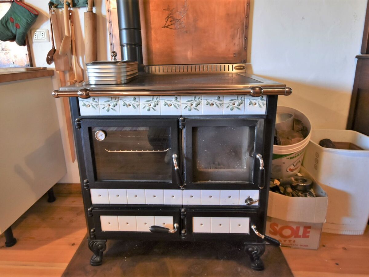 Cuisine ouverte dans l'entrée (4 feux, grille-pain, bouilloire électrique, micro-ondes, cafetière électrique) avec hauteur plafond 190 - 205 cm, table pour les repas et poêle à bois.