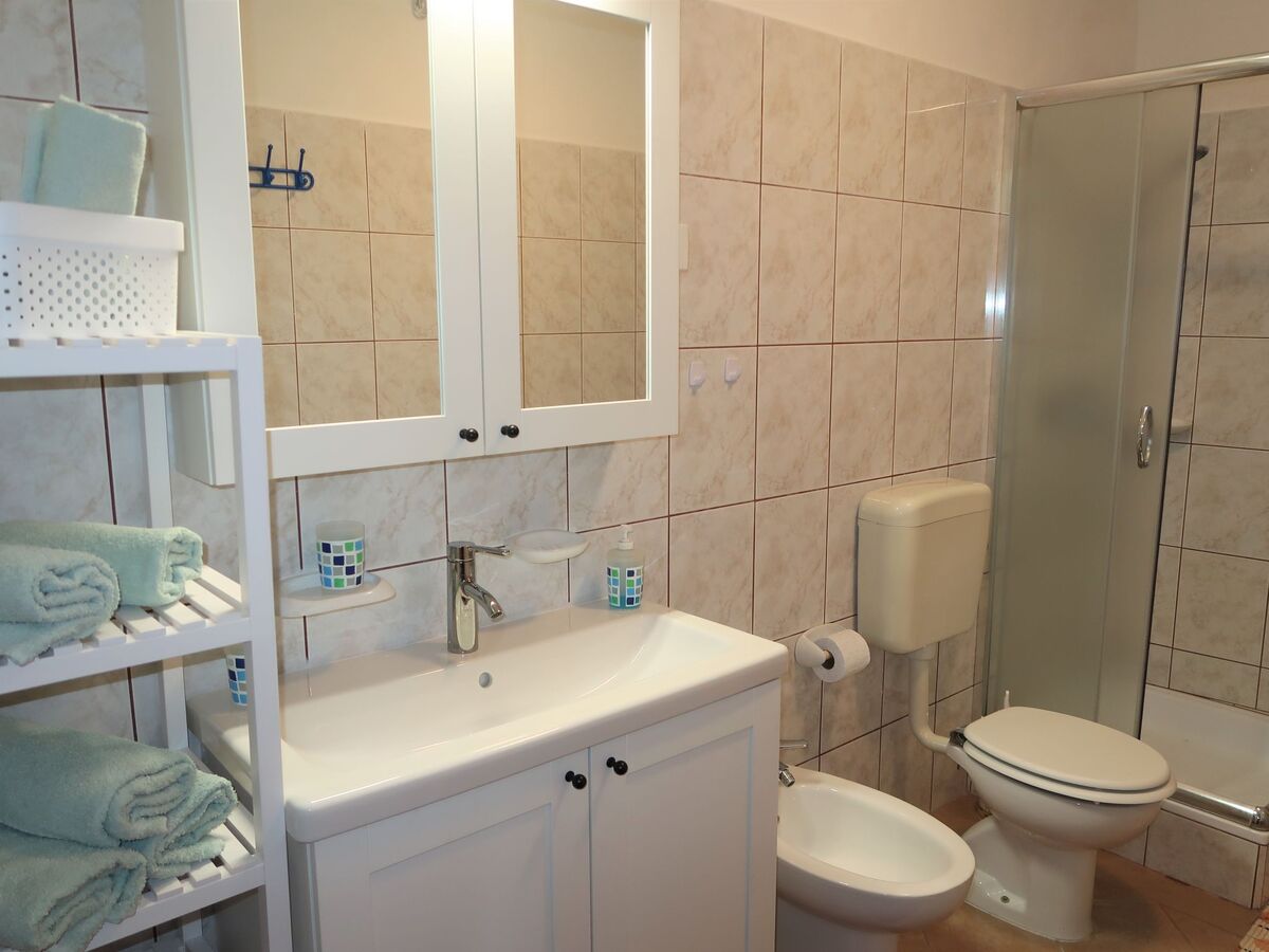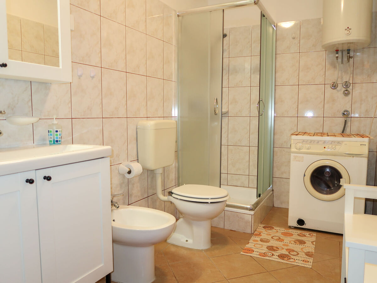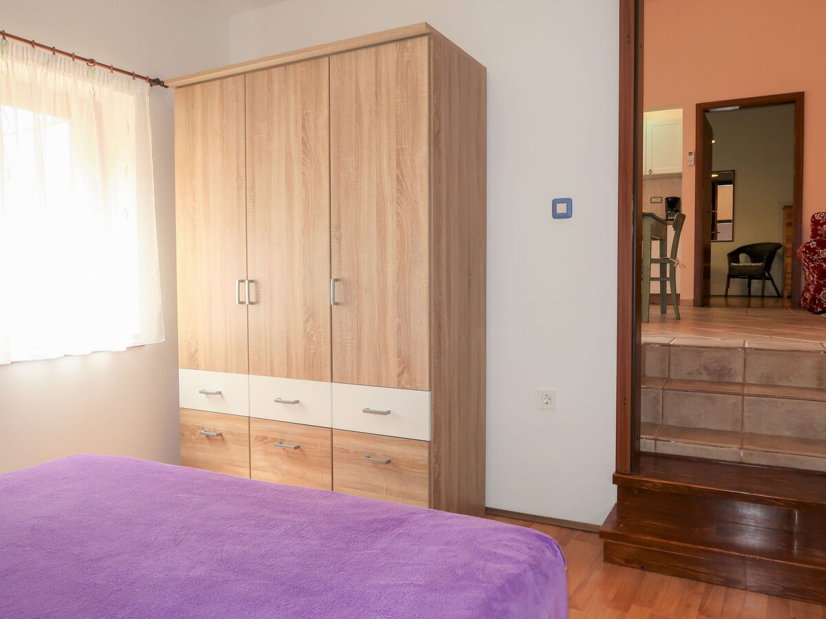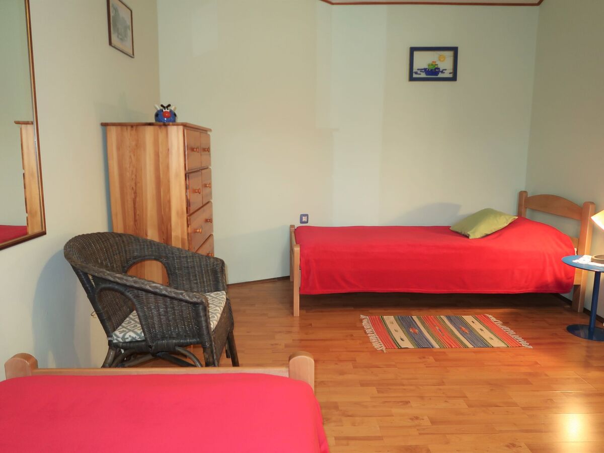 La chambre avec lit double, douche/bidet/WC se trouve 3 marches en dessous du salon/salle à manger, cuisine ouverte et chambre avec 2 lits.