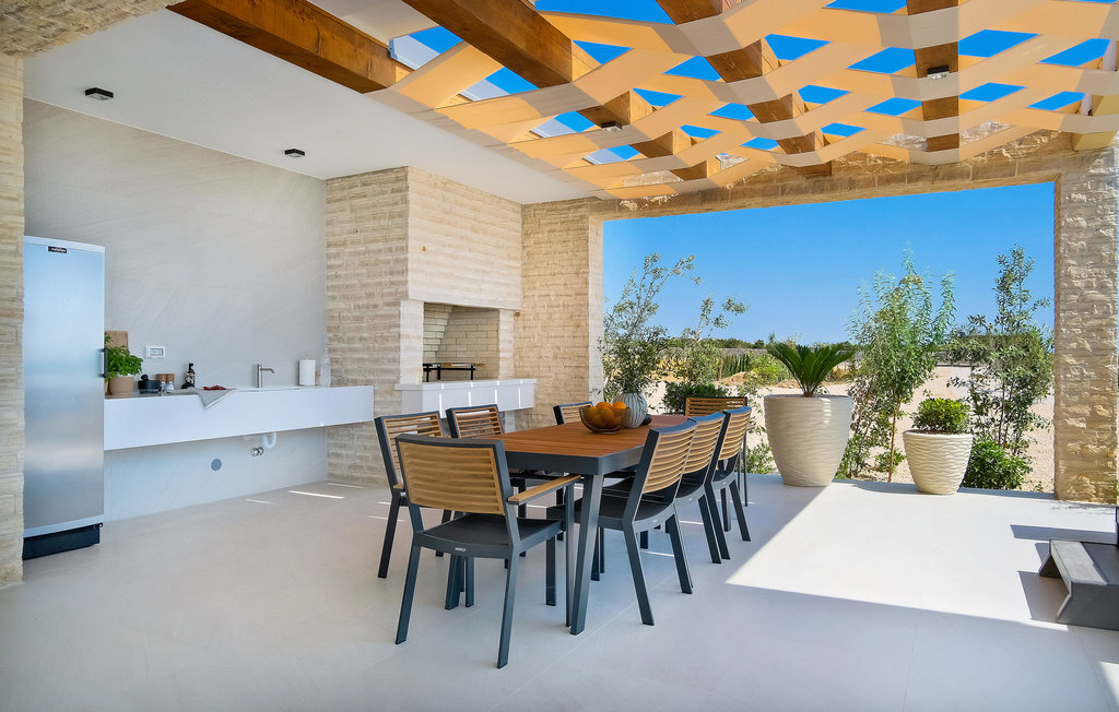 Non seulement l'intérieur, mais aussi l'extérieur font une impression convaincante. Nagez dans la piscine le matin et passez des heures de détente dans les meubles de salon ou sur les chaises longues sous le parasol pendant la journée. Profitez de la jolie cuisine extérieure et passez de nombreux moments conviviaux dans la salle à manger avec la mer en toile de fond. Le jacuzzi extérieur est l'endroit idéal pour terminer la journée dans une ambiance agréable.