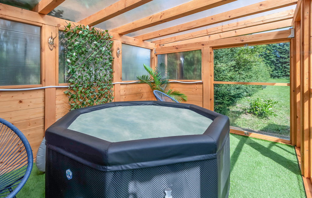 Bienvenue dans cette spacieuse maison en bois avec un beau jardin et un jacuzzi en plein air.