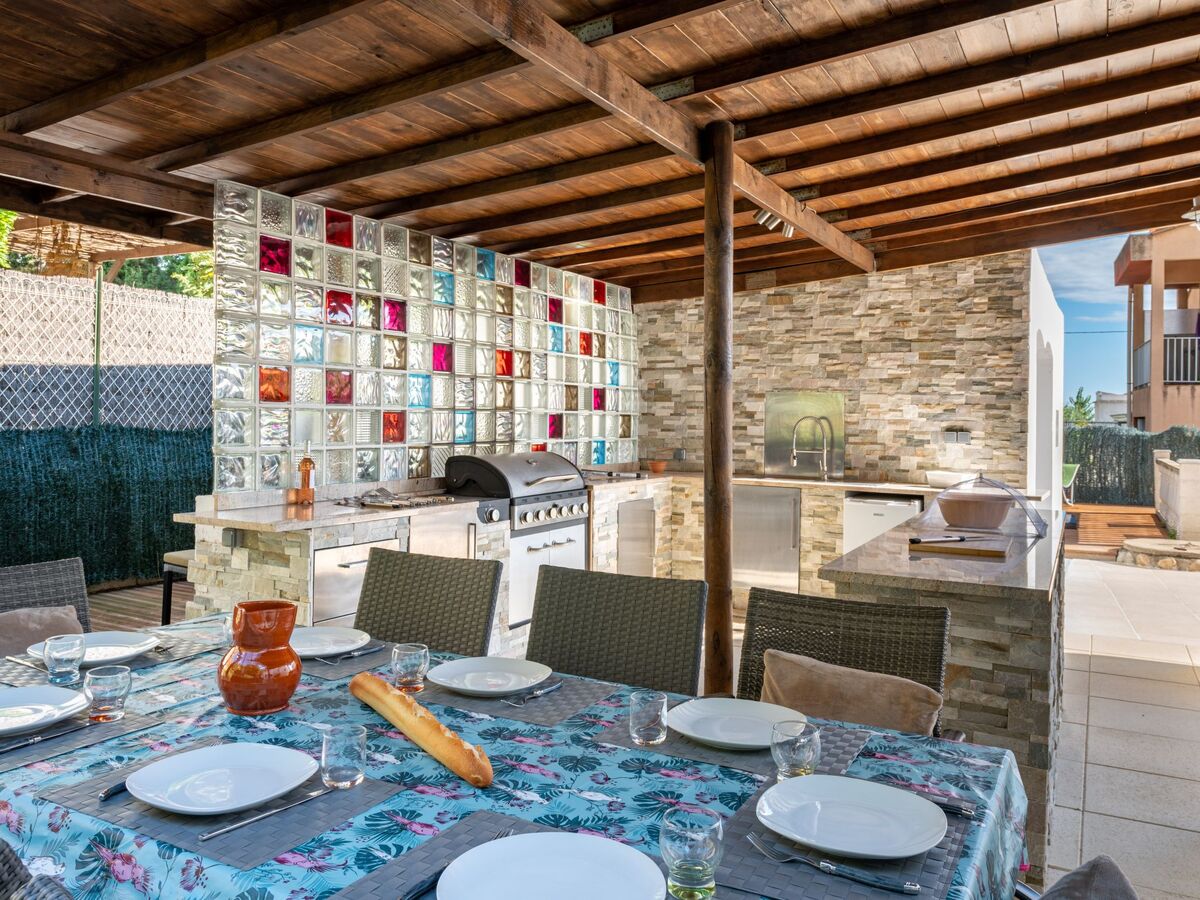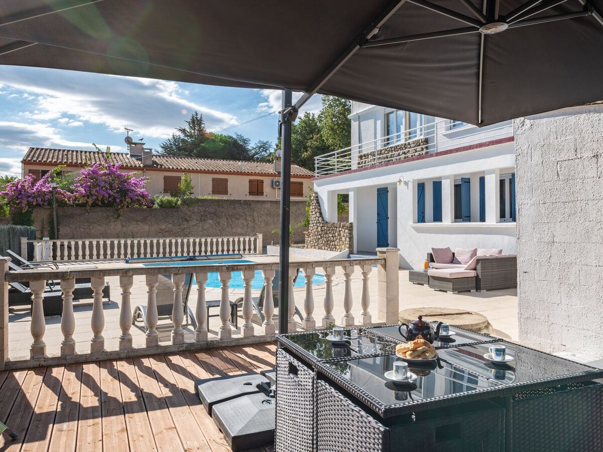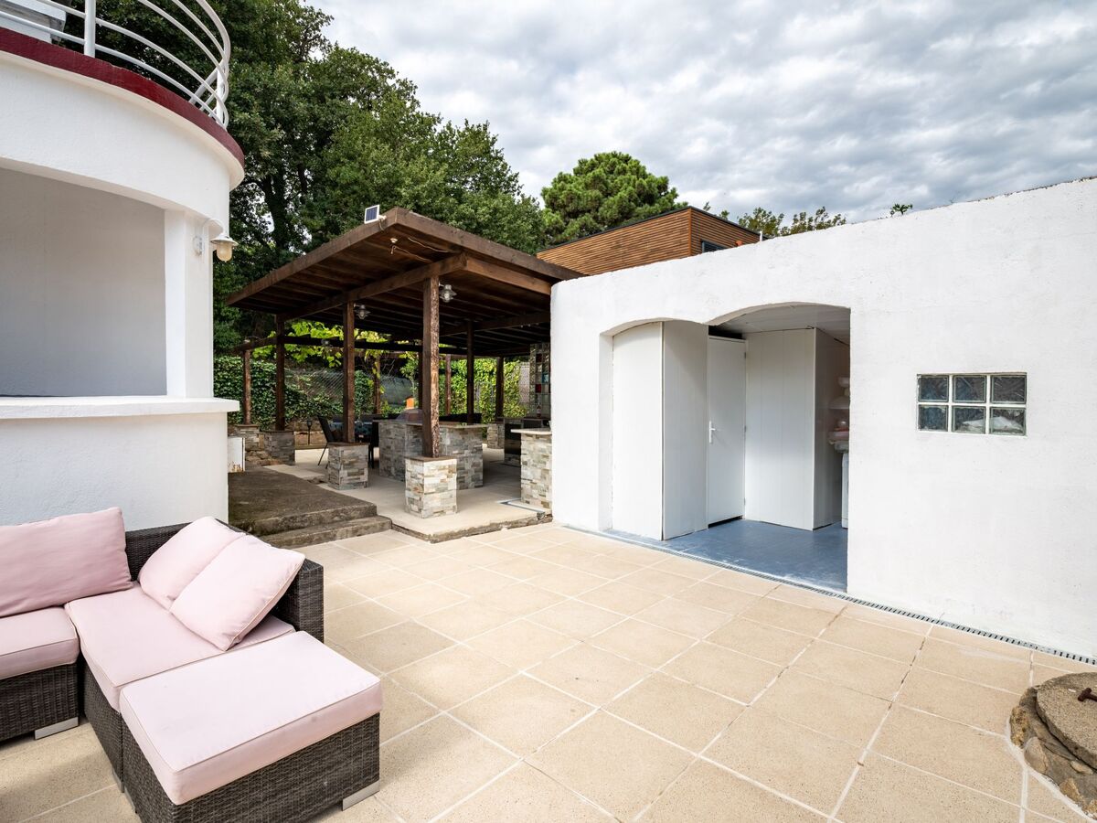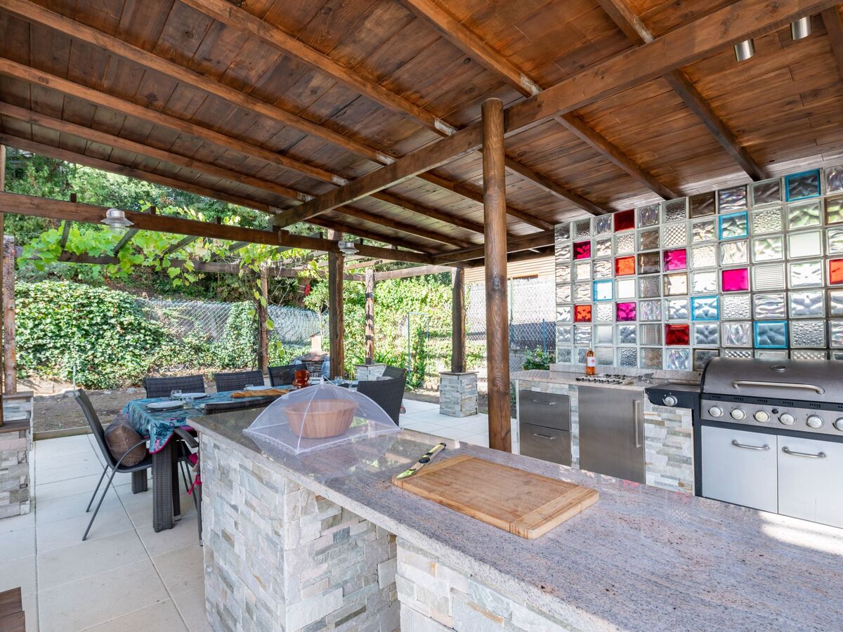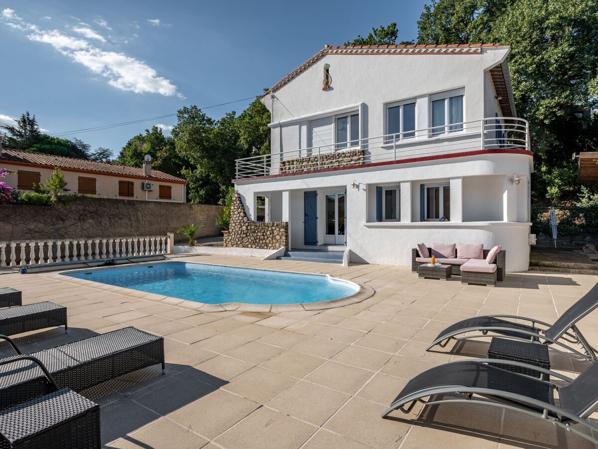 Douche/WC dans l'espace piscine, pool house avec réfrigérateur et plaque de cuisson, place de parking (pour 3 voitures) sur le terrain.