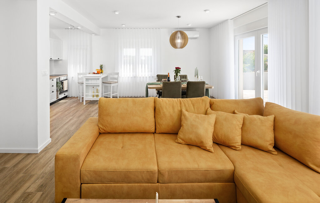 Passez ici des vacances sans souci en famille dans cette maison entièrement équipée où vous vous sentirez comme chez vous. Dans la grande salle de séjour, vous pouvez vous détendre, cuisiner ou jouer ensemble autour de la table à manger. De là, vous pouvez également accéder facilement à la terrasse et profiter du soleil pendant vos repas de vacances ou un bain rafraîchissant dans la piscine.