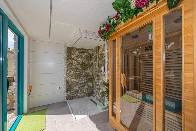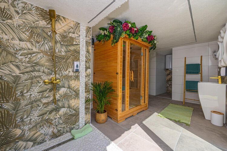 Rez-de-chaussée: (Salle de séjour(TV(satellite), coin salon), cuisine(table, bouilloire, grille-pain, plaque de cuisson, four, micro ondes, lave-vaisselle , combinaison réfrigérateur/congélateur), salle de bains(douche, lavabo, WC), terrasse(privé, clôturé)) Au 1er étage: (chambre(lit double), chambre(lit double), chambre(lit double), salle de bains(douche, lavabo, WC), salle de bains(douche, lavabo, WC), terrasse(privé)) Bain à bulles, sauna(privé), chauffage, climatisation, mobilier de jardin, barbecue, table à repasser, salon de jardin
