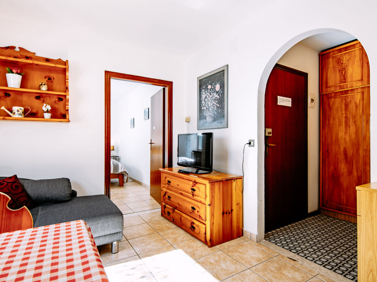 Aménagement simple: séjour/salle à manger avec 1 divan-lit, table pour les repas et TV (écran plat).