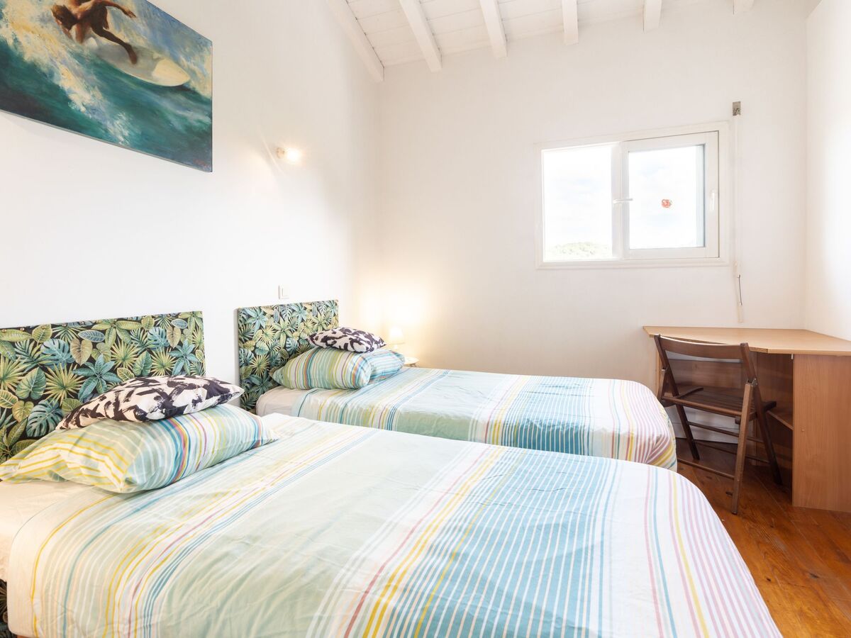 À l'étage supérieur: 3 chambres, chaque chambre avec: 1 lit (90 cm, longueur 190 cm), 1 grand-lit (140 cm, longueur 190 cm), douche/WC et TV (écran plat).
