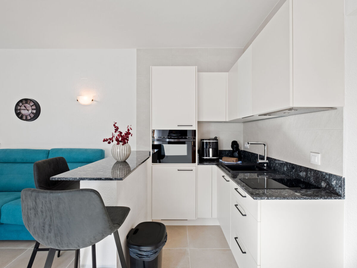 Cuisine ouverte (four, 3 plaques à induction, grille-pain, bouilloire électrique, congélateur, cafetière électrique).