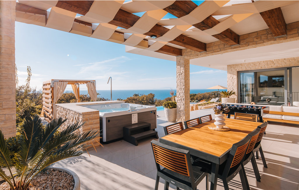 Bien-être à l'extérieur : Location de vacances disposant de chaises-longues et d'un ou plusieurs équipements tels que piscine extérieure, jacuzzi extérieur, lit à baldaquin de jardin etc...