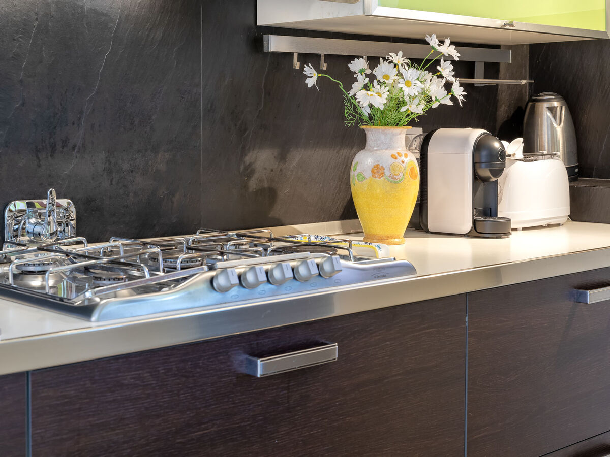 Grande coin cuisine (four, lave-vaisselle, 4 feux, grille-pain, bouilloire électrique, micro-ondes, cafetière électrique).