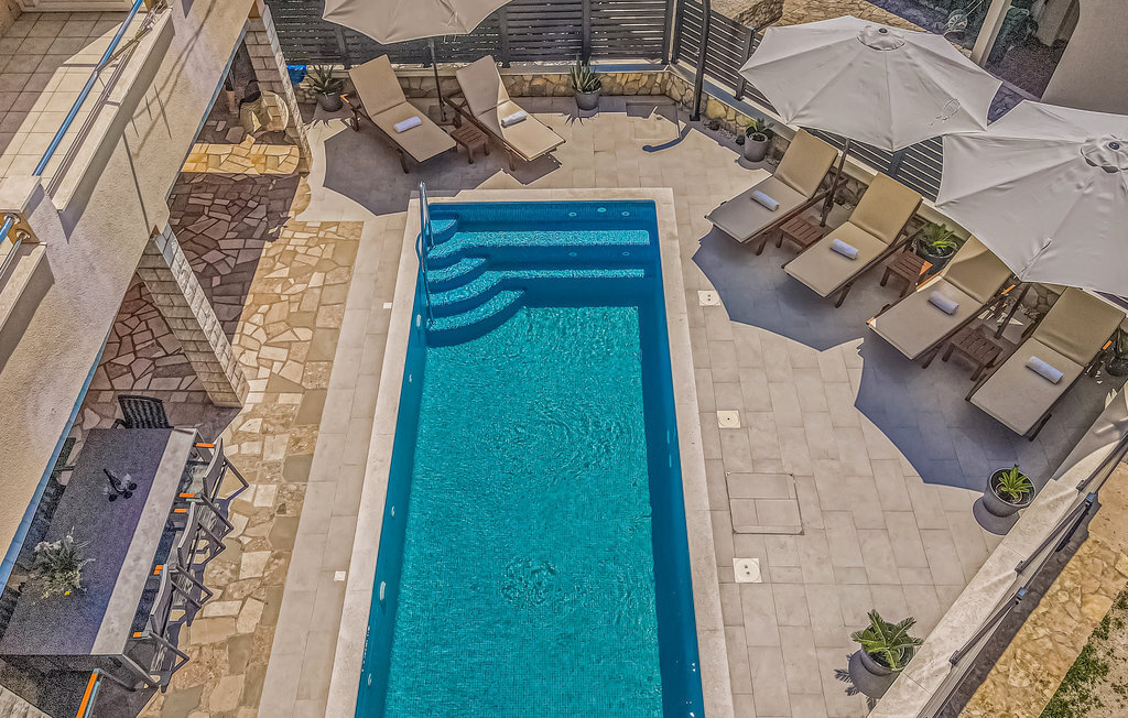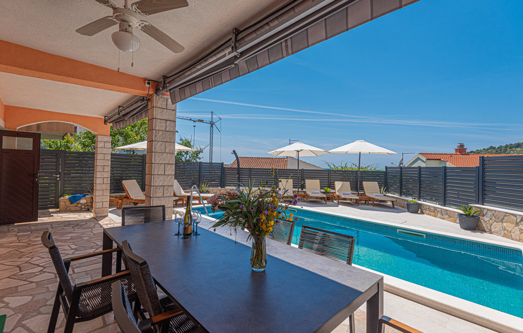 Réjouissez-vous de vos vacances au soleil et au bord de la mer Adriatique à Rogoznica-Razanj. Cette grande maison s'étend sur trois étages, de sorte que deux familles d'amis peuvent facilement y passer leurs vacances ensemble. Les deux étages supérieurs sont entièrement équipés, avec une cuisine-salon, une salle de bain, des chambres à coucher et un balcon, de sorte que vous puissiez profiter de votre intimité en tant que petite famille. Au rez-de-chaussée, vous pouvez vous réunir, préparer votre petit-déjeuner ensemble et le prendre sur la terrasse couverte au bord de la piscine. Passez ensuite de nombreuses heures à vous baigner, à prendre le soleil et à vous détendre, et retrouvez-vous le soir, après d'autres activités, pour un barbecue en plein air.