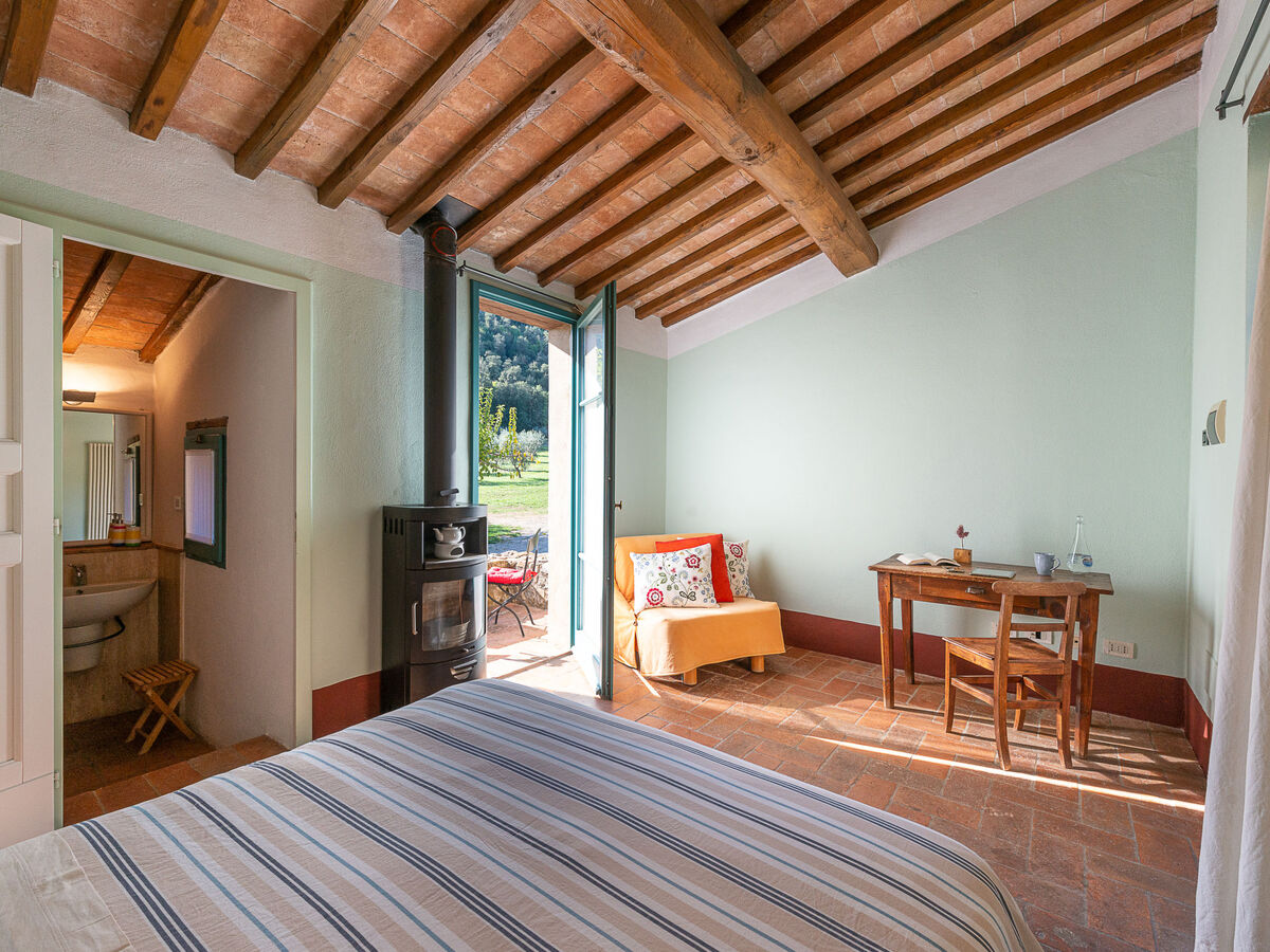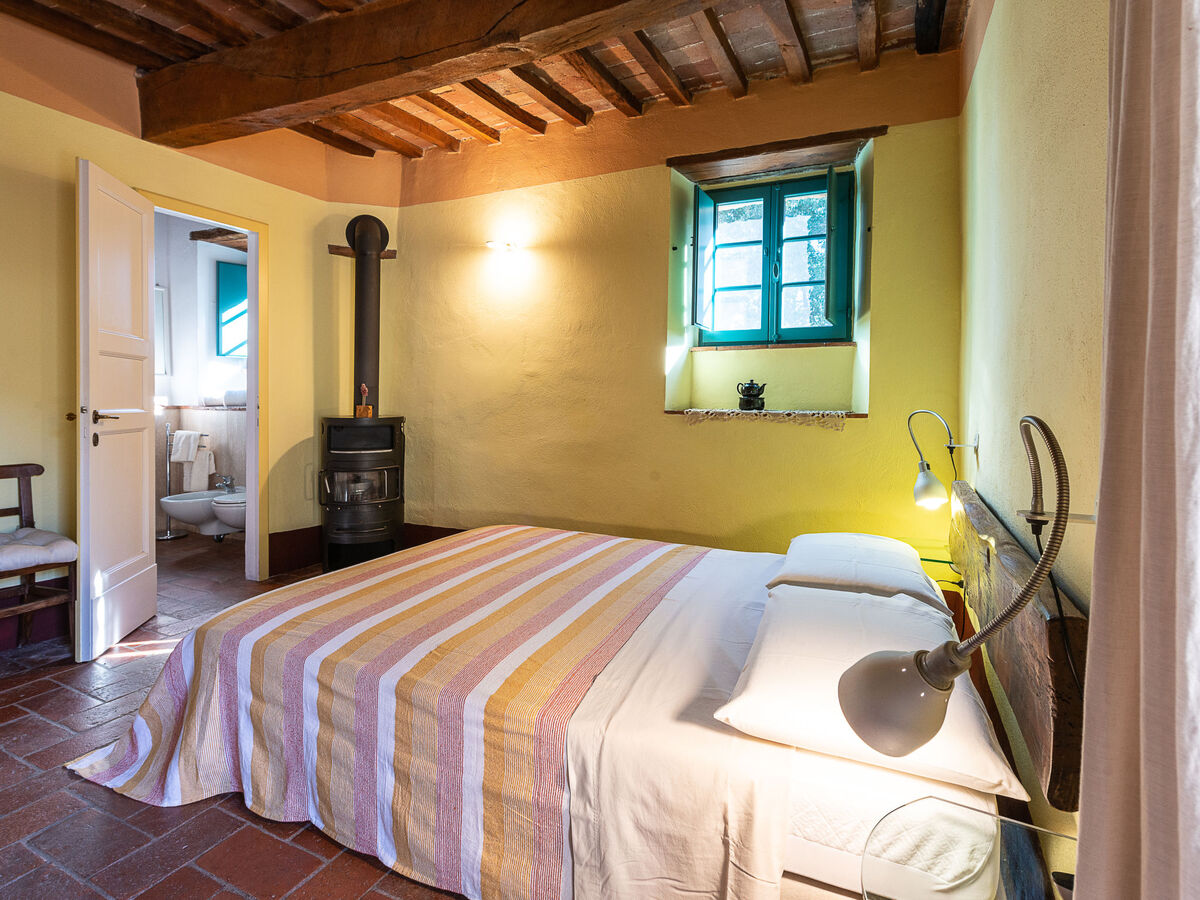 1 chambre double, sans fenêtre avec douche/bidet/WC et poêle à bois.