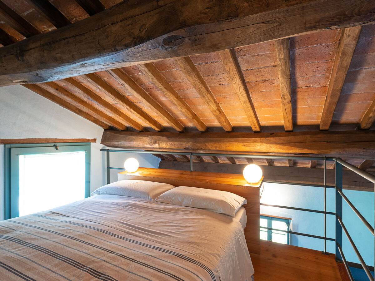 1 grande chambre mansardée, ouverte sur 2 niveaux avec 1 divan-lit double, 1 lit double, douche/bidet/WC et poêle à bois.