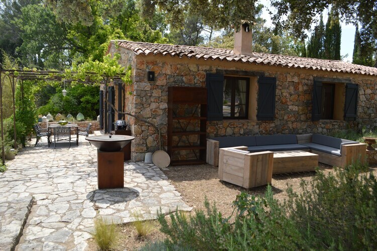 Vous entrez dans le domaine de La Bastidane par un portail d'entrée électrique. Une longue allée vous mène à la maison. C'est une maison de plain-pied en pierres naturelles avec volets en bois et murs épais, tout à fait dans le respect des règles du charme provençal.
