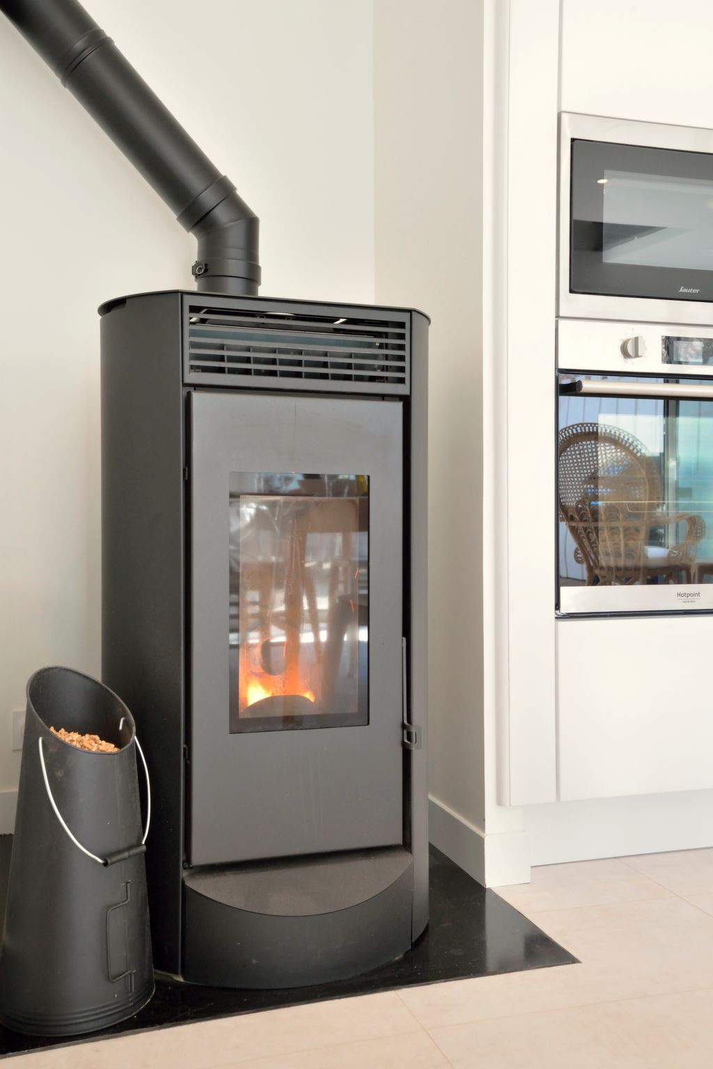 Aménagement confortable et agréable: séjour avec poêle suédois et TV.