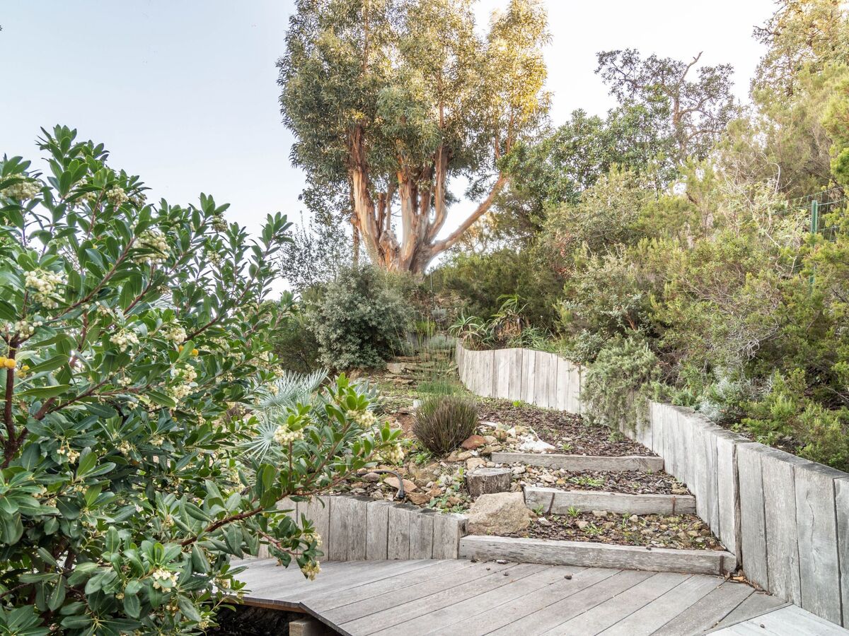 Vue mer depuis la terrasse en haut du jardin.