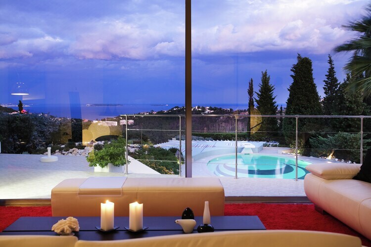 Grand appartement de 200 m² occupant tout l’étage supérieur d’une villa d’architecte sur un site d’exception avec plusieurs terrasses plein sud et vues panoramiques mer et montagnes.