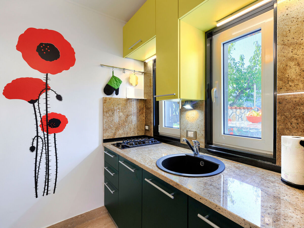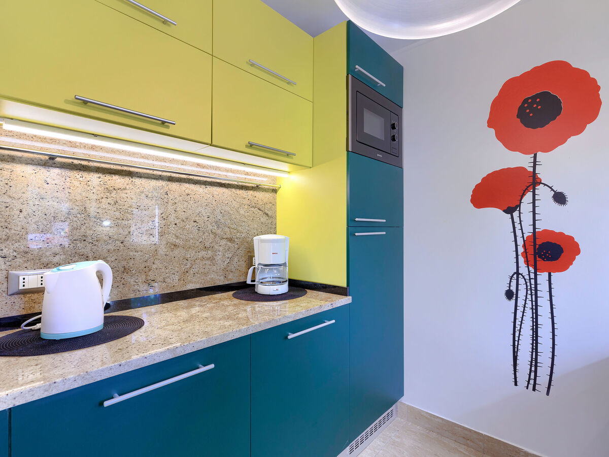 Cuisine ouverte (2 feux, grille-pain, bouilloire électrique, micro-ondes, congélateur, cafetière électrique).