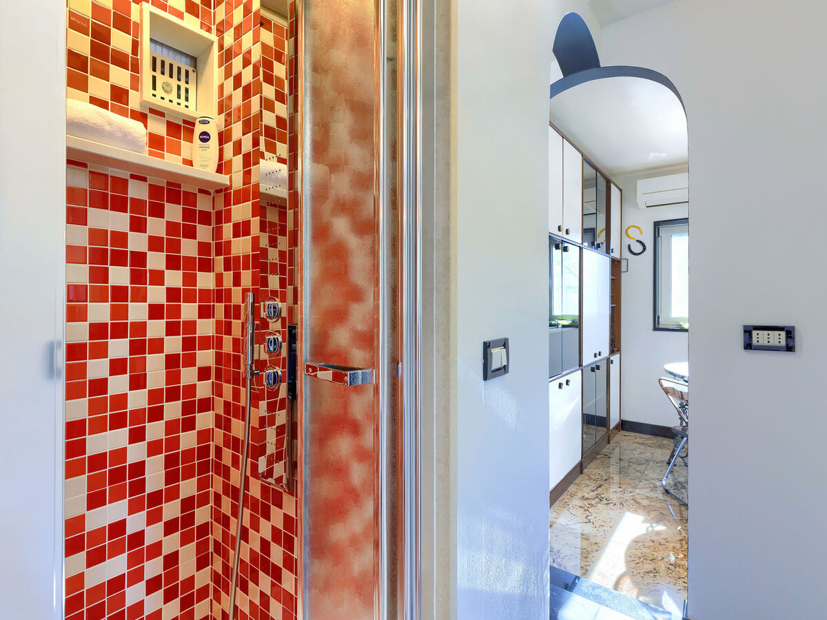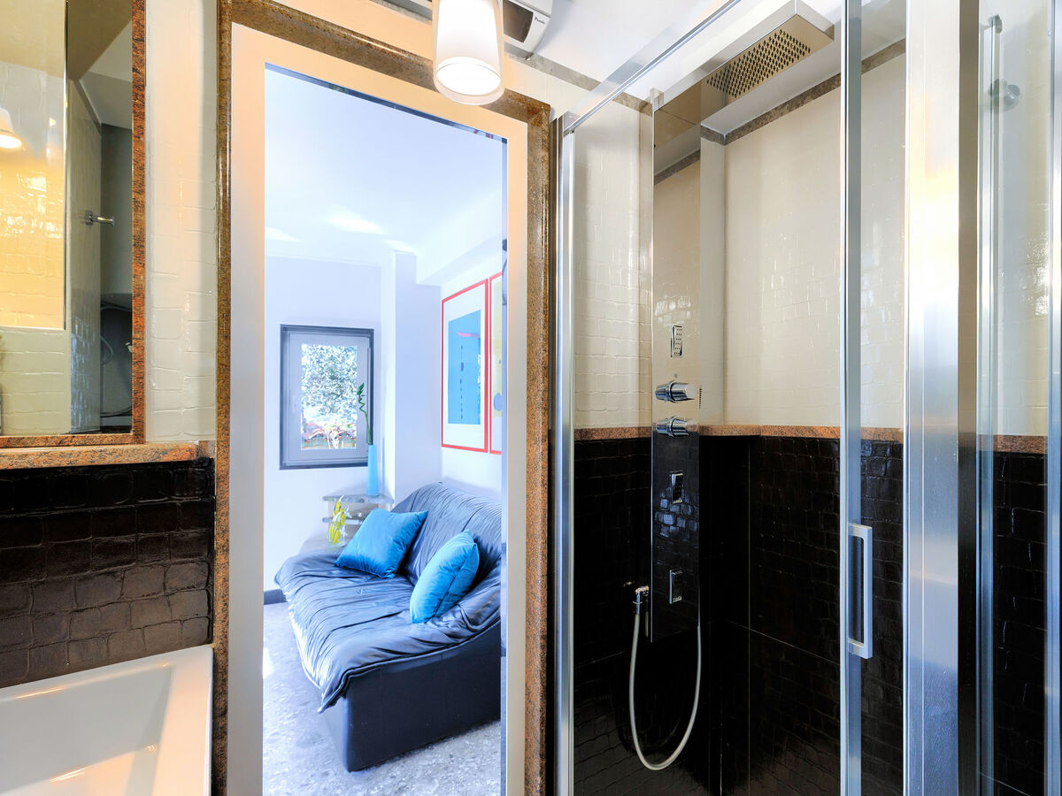 Douche extérieure, terrasse (15 m2), meubles de jardin.