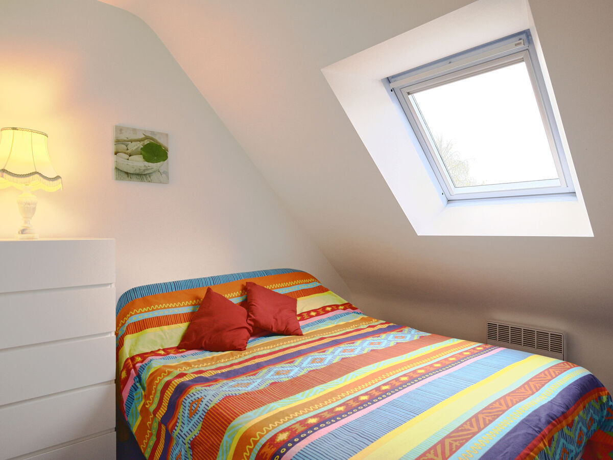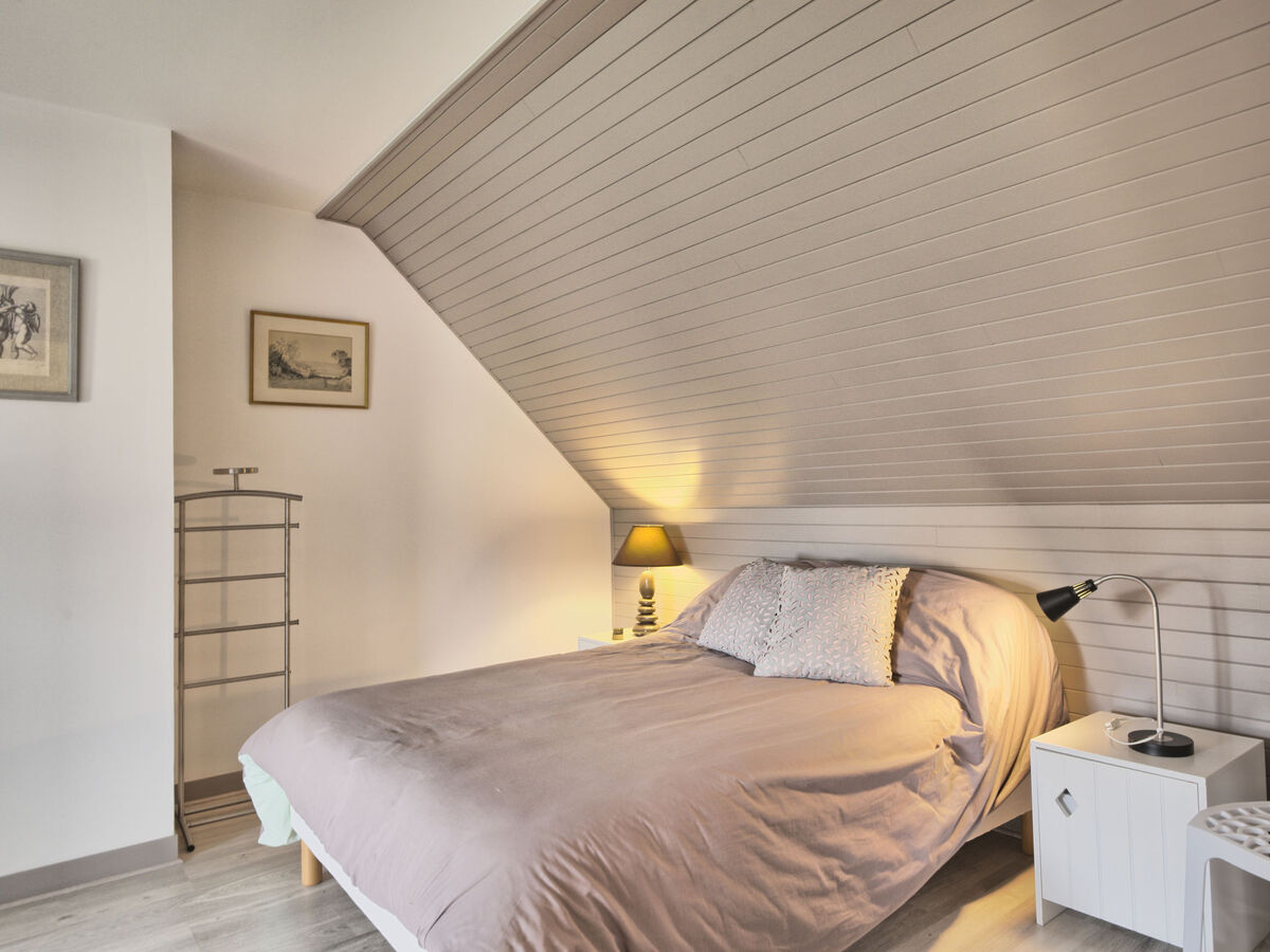 1 petite chambre, mansardée avec 1 grand-lit (140 cm, longueur 190 cm).