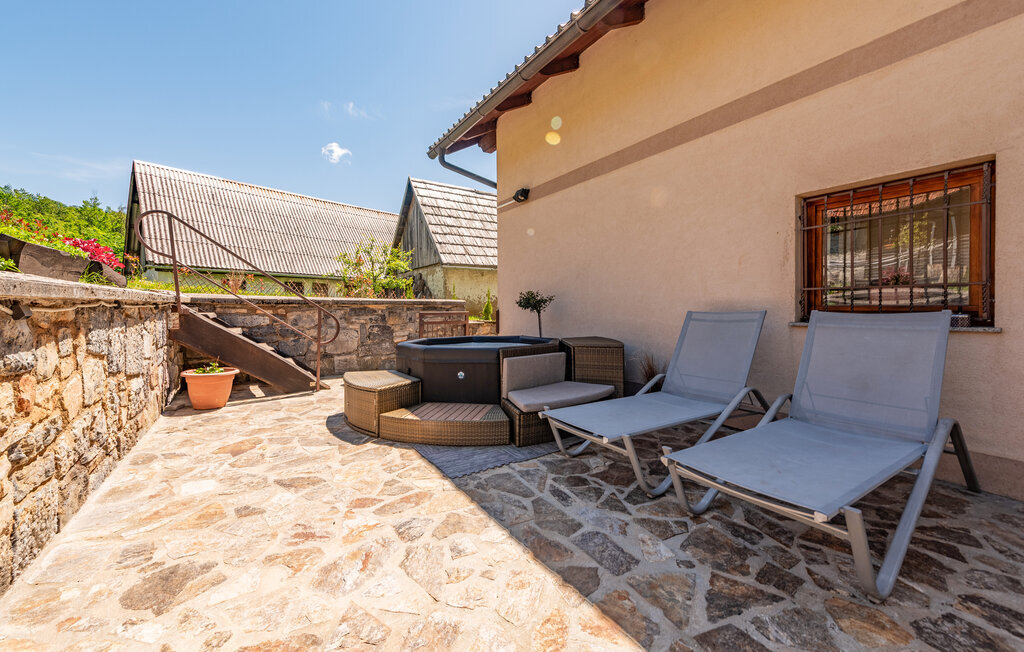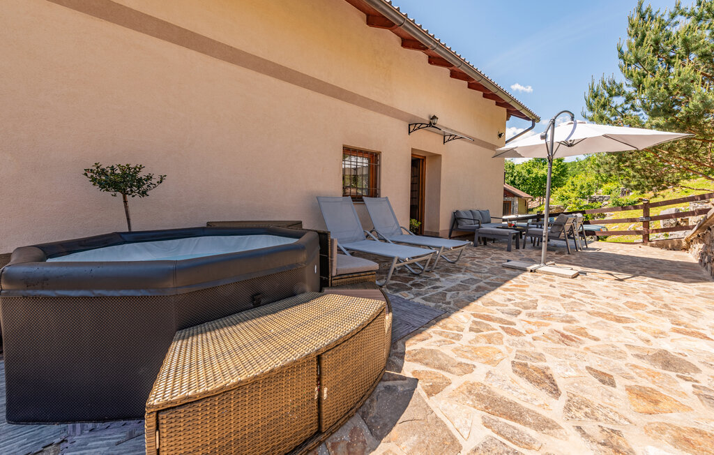 Bien-être à l'extérieur : Location de vacances disposant de chaises-longues et d'un ou plusieurs équipements tels que piscine extérieure, jacuzzi extérieur, lit à baldaquin de jardin etc...
