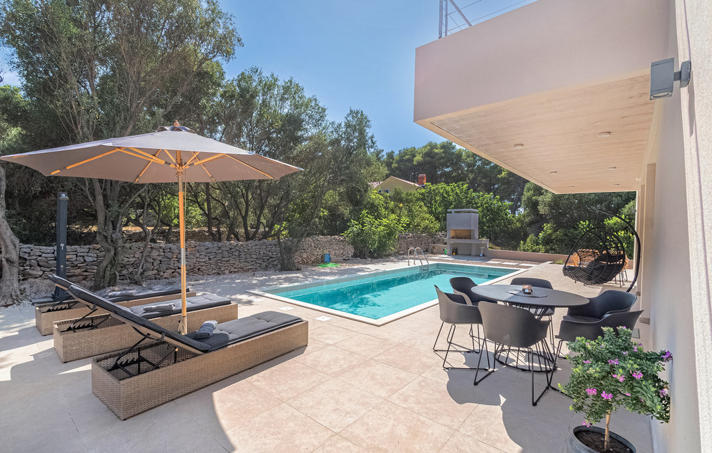L'extérieur n'a cependant pas à rougir de la maison, car une piscine avec une grande terrasse ensoleillée vous invite à profiter de nombreuses heures de baignade et la terrasse couverte avec vue sur la mer est l'endroit idéal pour se détendre et terminer les soirées d'été conviviales et tièdes par des grillades.