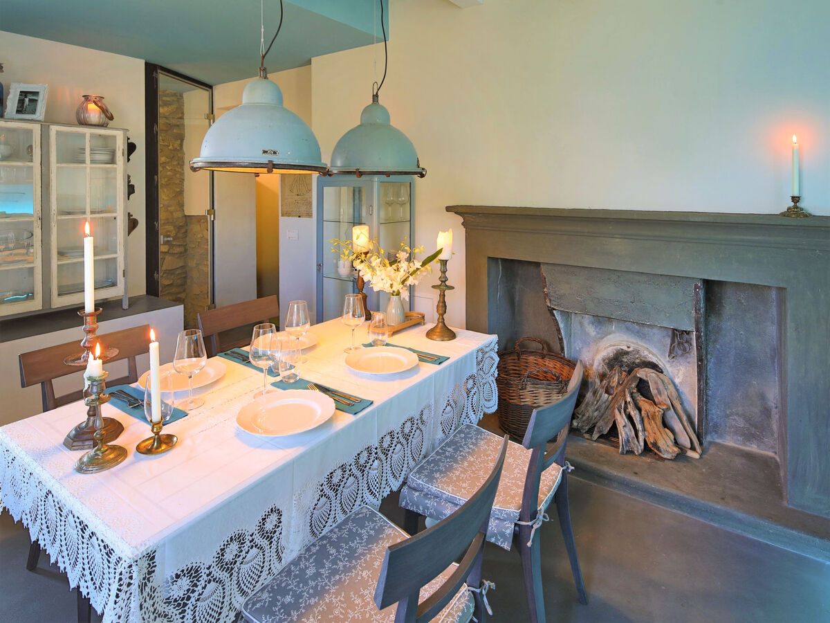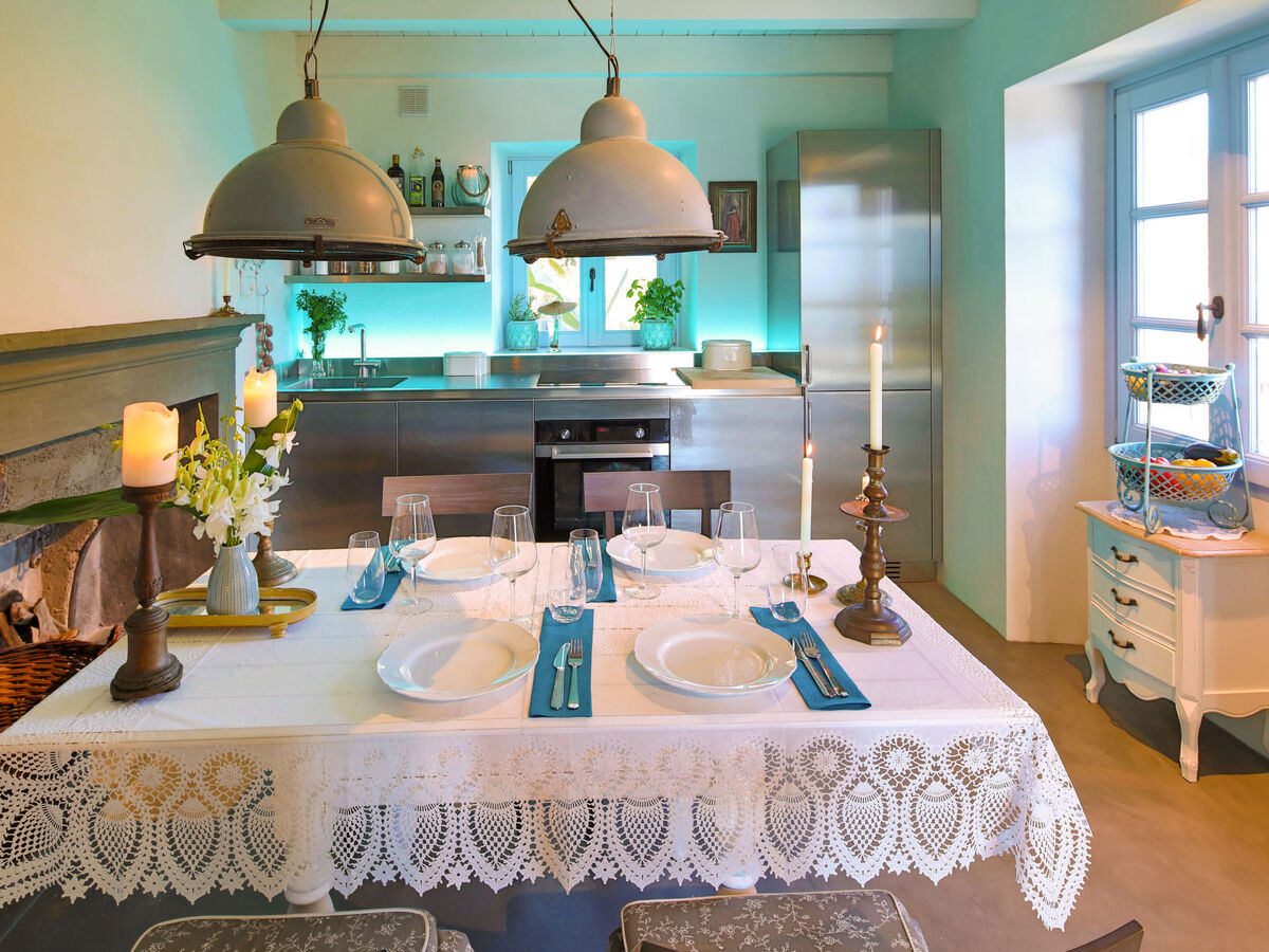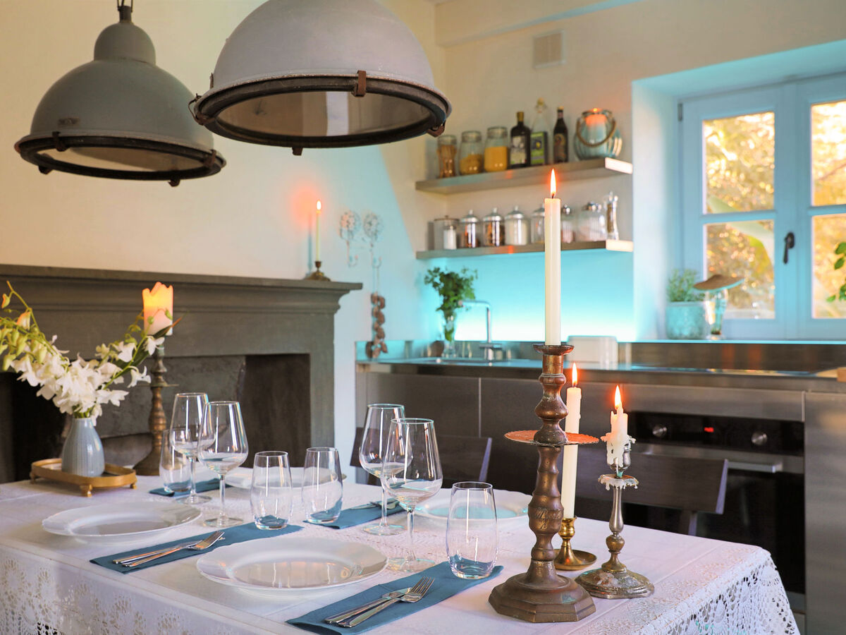 Cuisine (four, lave-vaisselle, 4 plaques à induction, cafetière électrique) avec table pour les repas, cheminée (uniquement à titre de décoration).