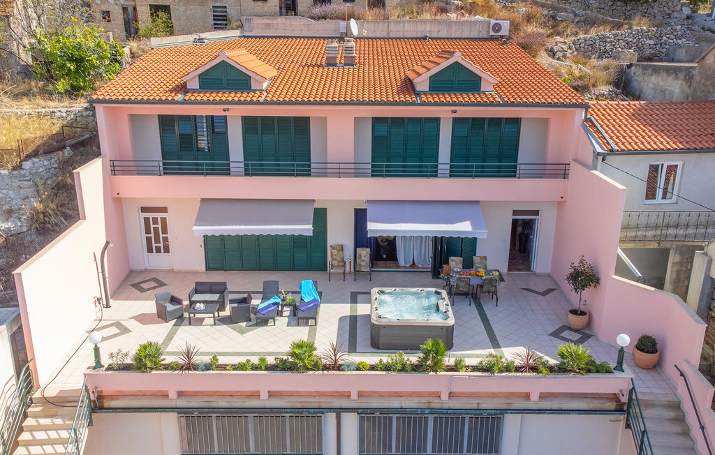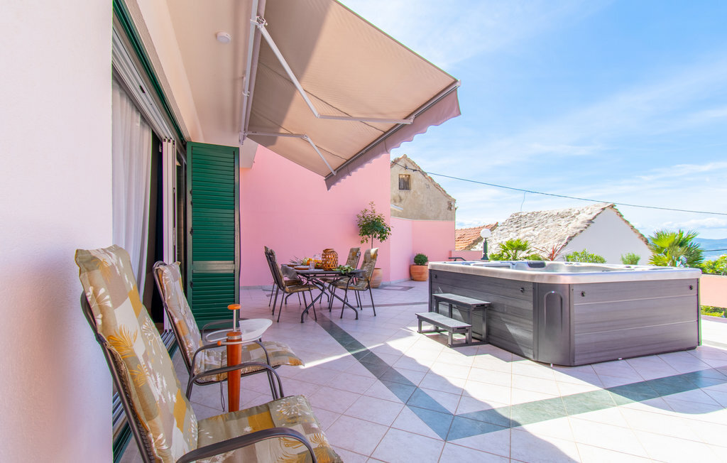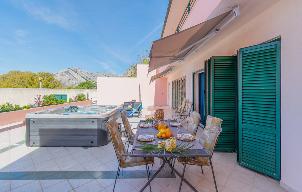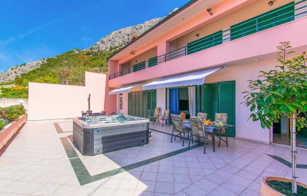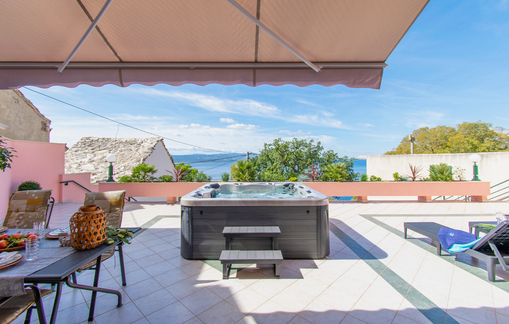 Bien-être à l'extérieur : Location de vacances disposant de chaises-longues et d'un ou plusieurs équipements tels que piscine extérieure, jacuzzi extérieur, lit à baldaquin de jardin etc...