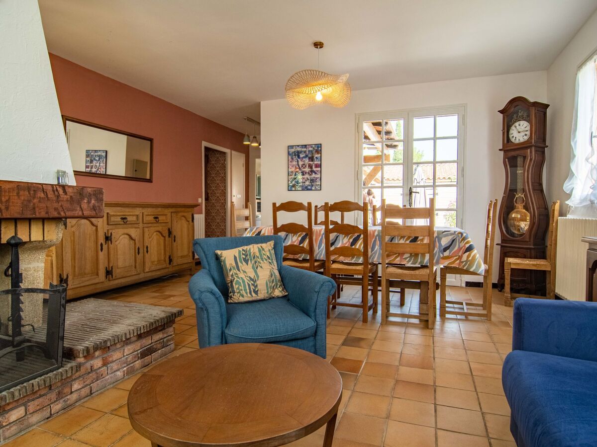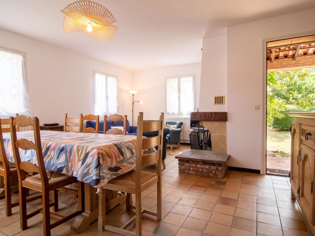 Aménagement simple: séjour/salle à manger avec cheminée, table pour les repas et TV (écran plat).