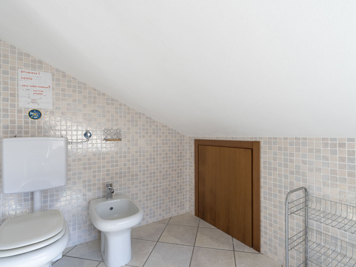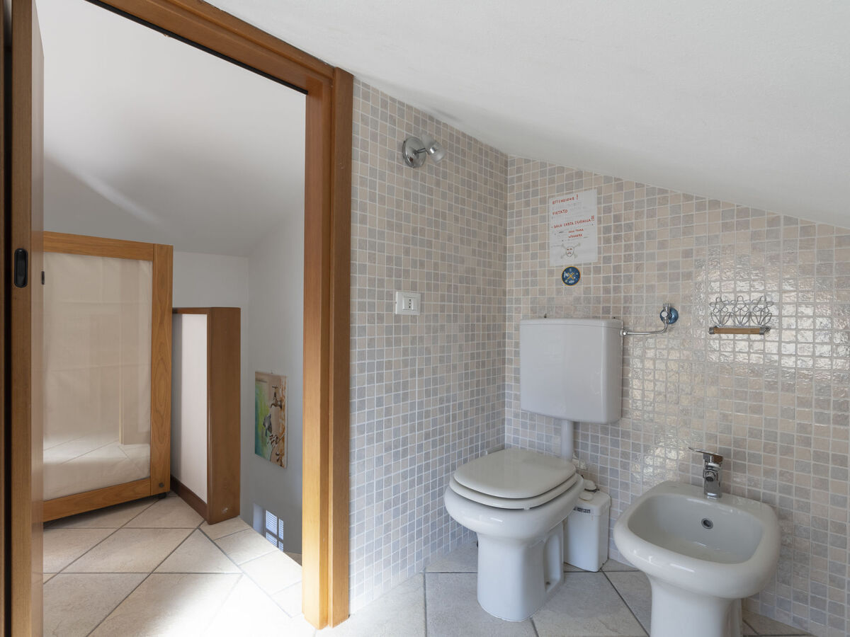 À l'étage supérieur: 1 chambre double, mansardée hauteur plafond 100 - 210 cm avec WC séparés.
