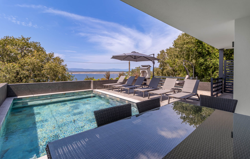 Outre les espaces intérieurs, vous pouvez passer presque toute la journée à l'extérieur. Une grande terrasse avec une piscine privée et un jacuzzi avec vue sur la mer vous promettent détente et plaisir au soleil. Le soir, faites un barbecue dans le jardin et dégustez de délicieux plats sur votre grande terrasse couverte.