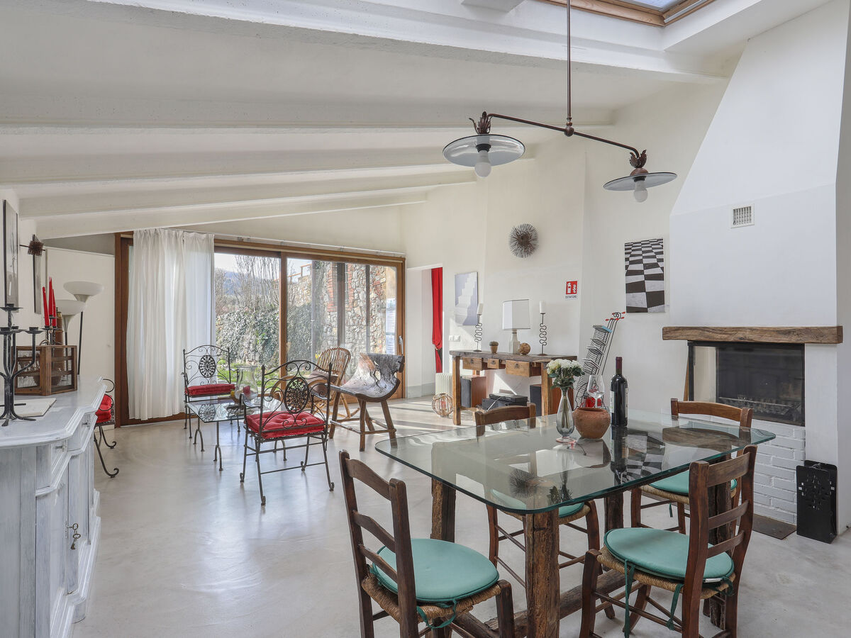 Spacieux et clair, complètement rénovée, aménagement confortable et de style: grand séjour/salle à manger ouvert avec cheminée, table pour les repas et coin-cuisine.