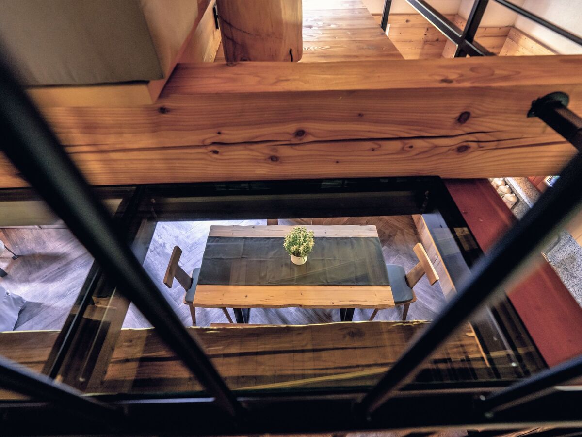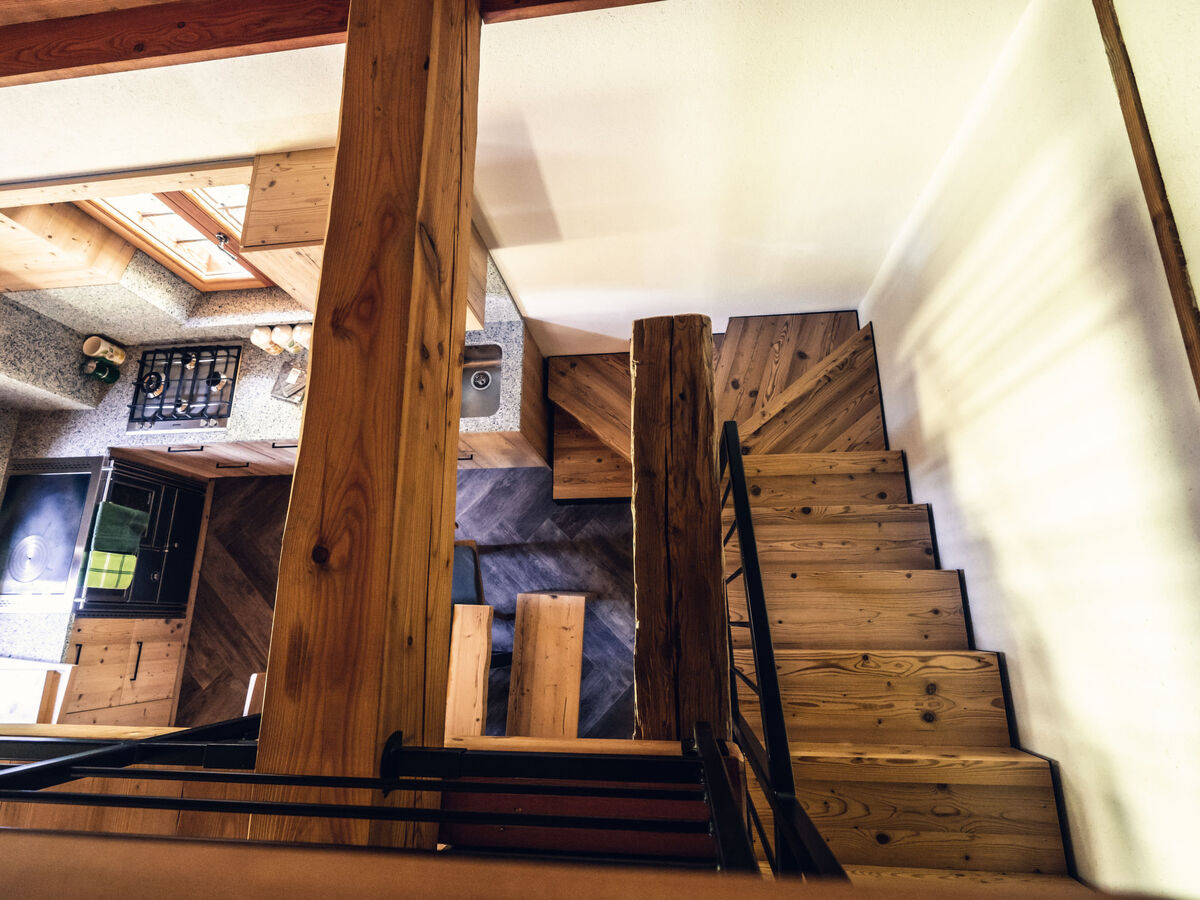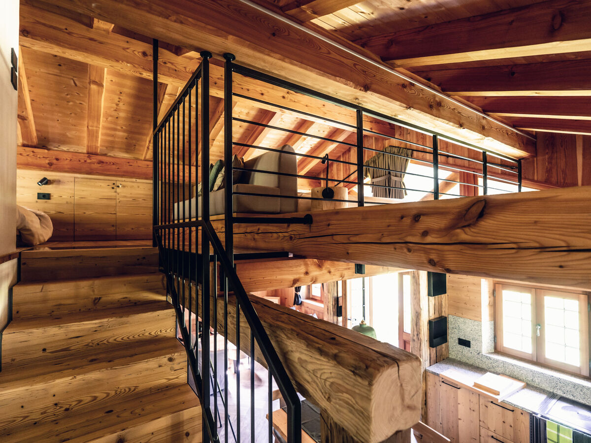 Spacieux et clair, partiellement mansardé, aménagement moderne et avec beaucoup de bois: séjour/salle à manger avec table pour les repas et TV (satellite) (écran plat), poêle à bois.