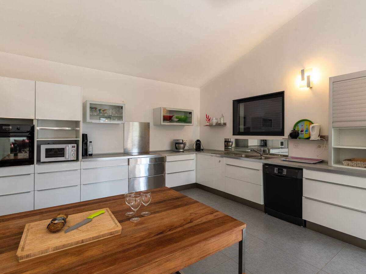 Cuisine ouverte (four, lave-vaisselle, 4 plaques à induction, bouilloire électrique, micro-ondes, cafetière électrique) avec table pour les repas.