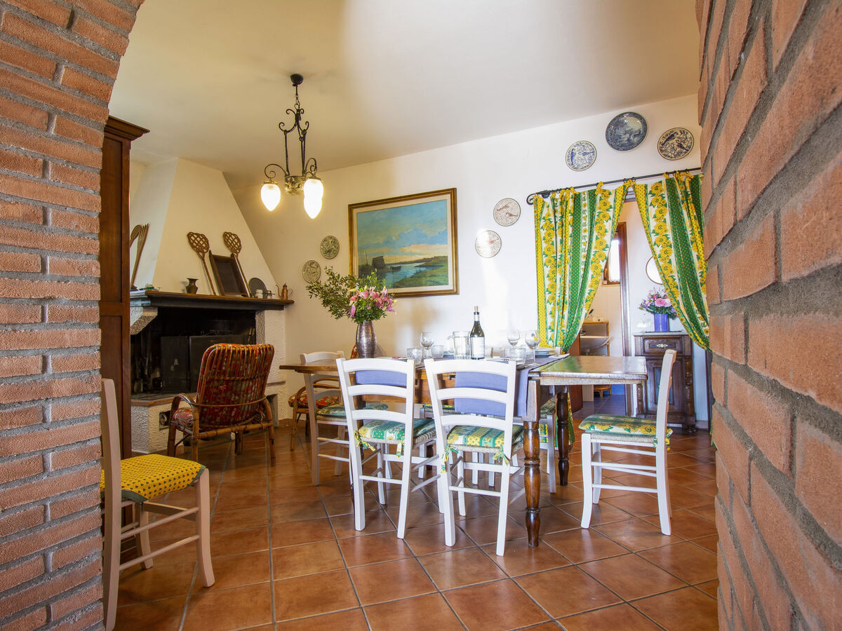 Salle à manger avec cheminée (uniquement à titre de décoration), table pour les repas.