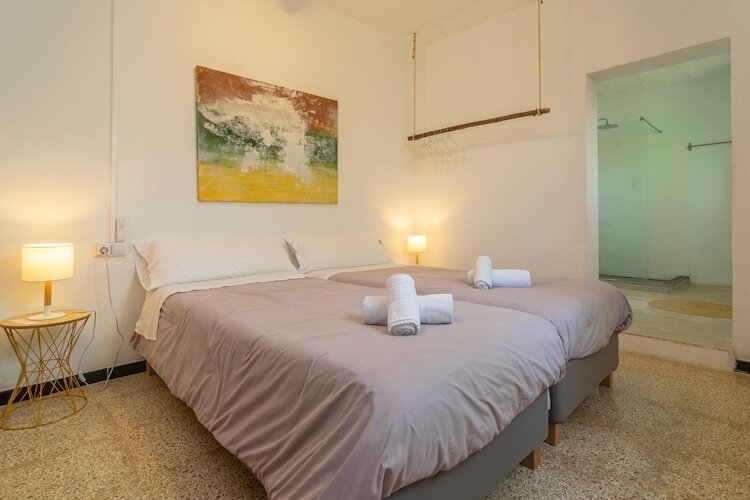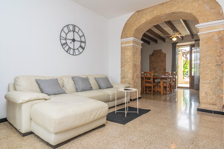 El interior de la casa de dos plantas es sencillo con toques modernos combinados con elementos tradicionales. En la planta baja encontramos la sala con TV-sat. Comunica con el comedor a través de una arco y este a su vez está conectado con la cocina que ofrece fogones de gas. En la lavanderÃa está la lavadora, plancha y tabla para planchar. Hay 5 dormitorios, todos con 2 camas individuales y aire acondicionado. Tres de ellos están en la planta baja y uno tiene baño en suite con ducha. Los dos de la primera planta tienen también baño en suite con ducha -uno de ellos con la ducha en la misma habitación. Hay otro baño con bañera para toda la casa en la planta baja y un aseo exterior. El equipamiento se completa con 7 ventiladores de techo y cuna y trona si viajan con su bebé.