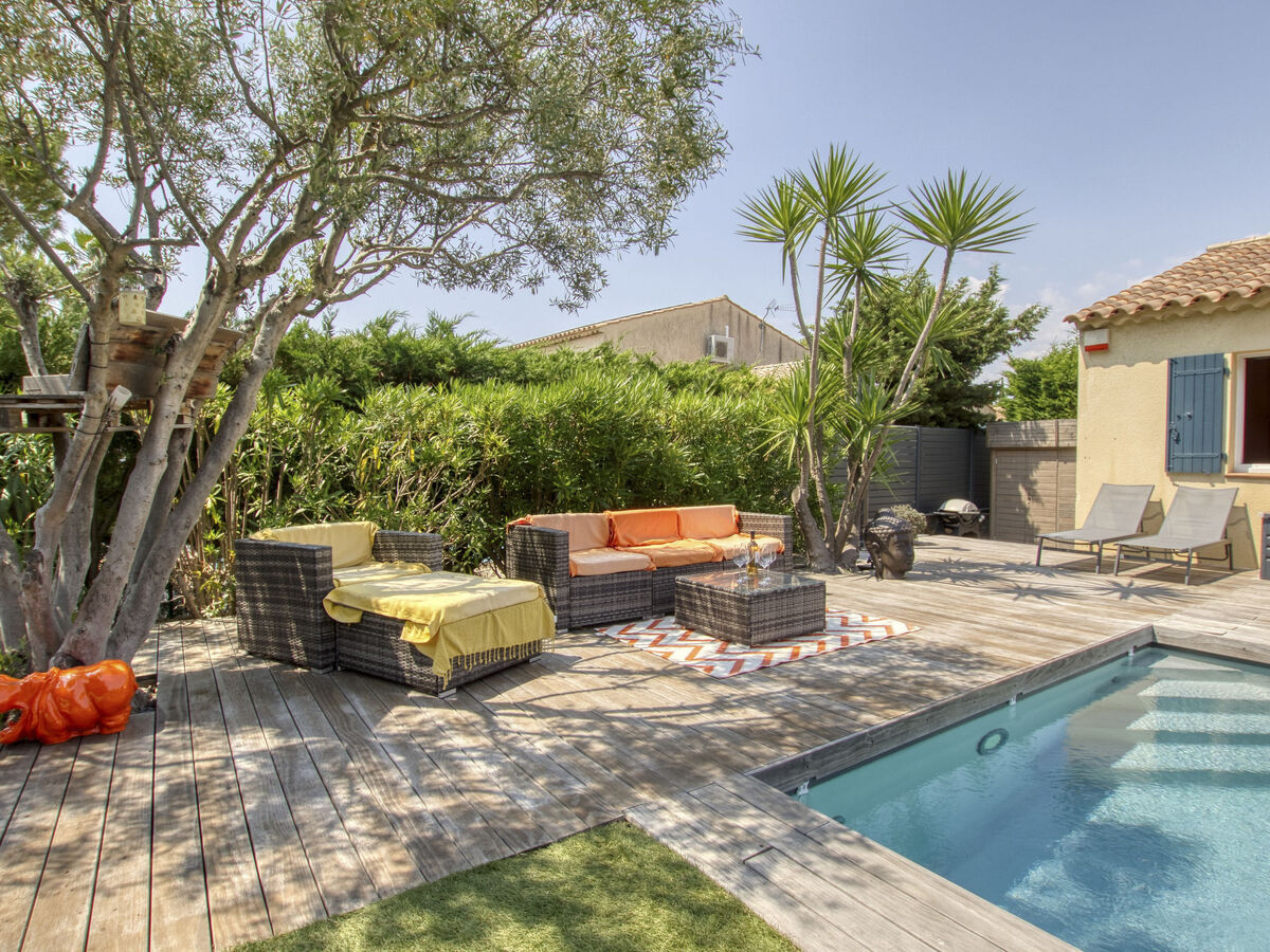 A usage privé: terrain 500 m2 (clôturé), piscine rectangulaire (4 x 7 m, profondeur 100 - 180 cm, disponibilité saisonnière: 05.Jul.