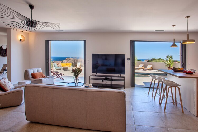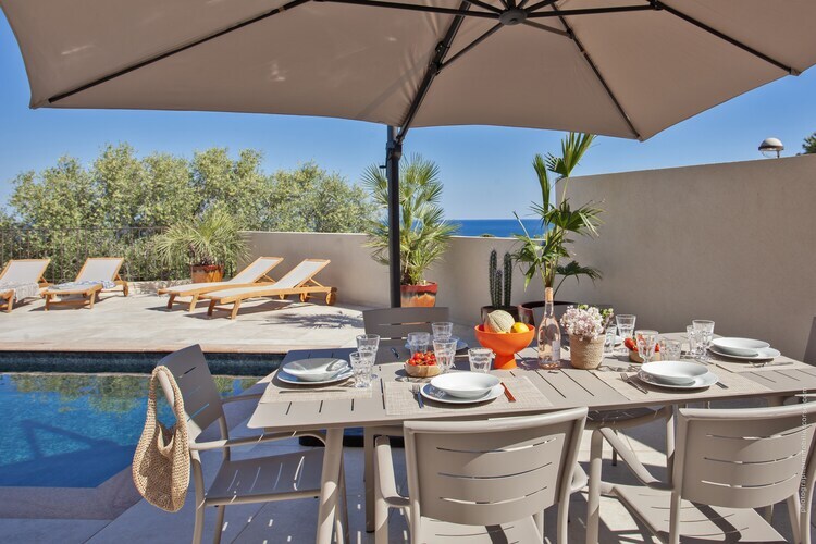 Cette villa moderne de 200 m² climatisée offre une vue sur la mer et les îles. Commencez la journée par un plongeon dans la piscine privée et passez vos après-midi à vous prélasser au soleil. Idéal pour des vacances en famille ou entre amis !