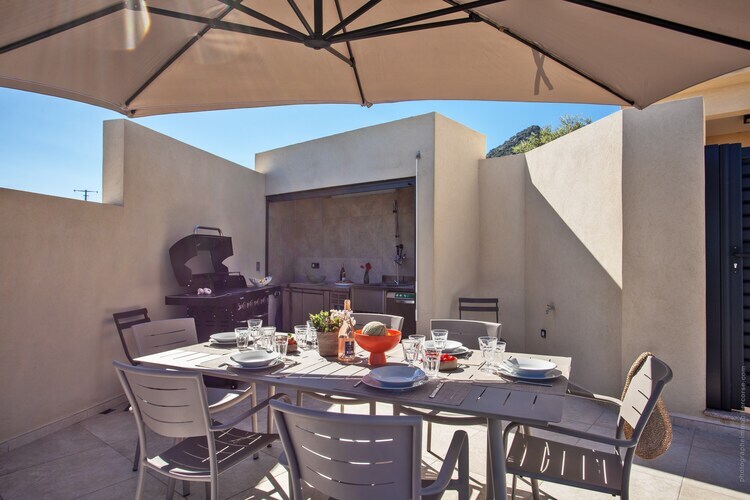 Le salon spacieux dispose d'une cuisine moderne et entièrement équipée pour préparer vos plats préférés. De plus, le logement dispose d'un barbecue et d'une cuisine extérieure. Toutes les chambres offrent une vue sur la terrasse et la mer. Ce havre de paix s'offre un jacuzzi pour une soirée relaxante.