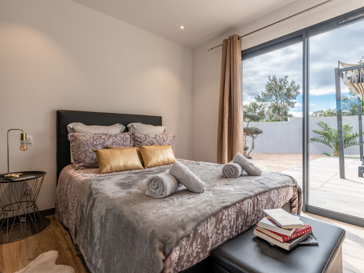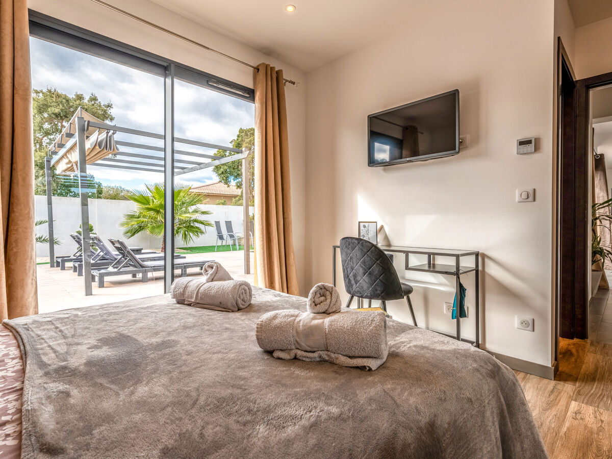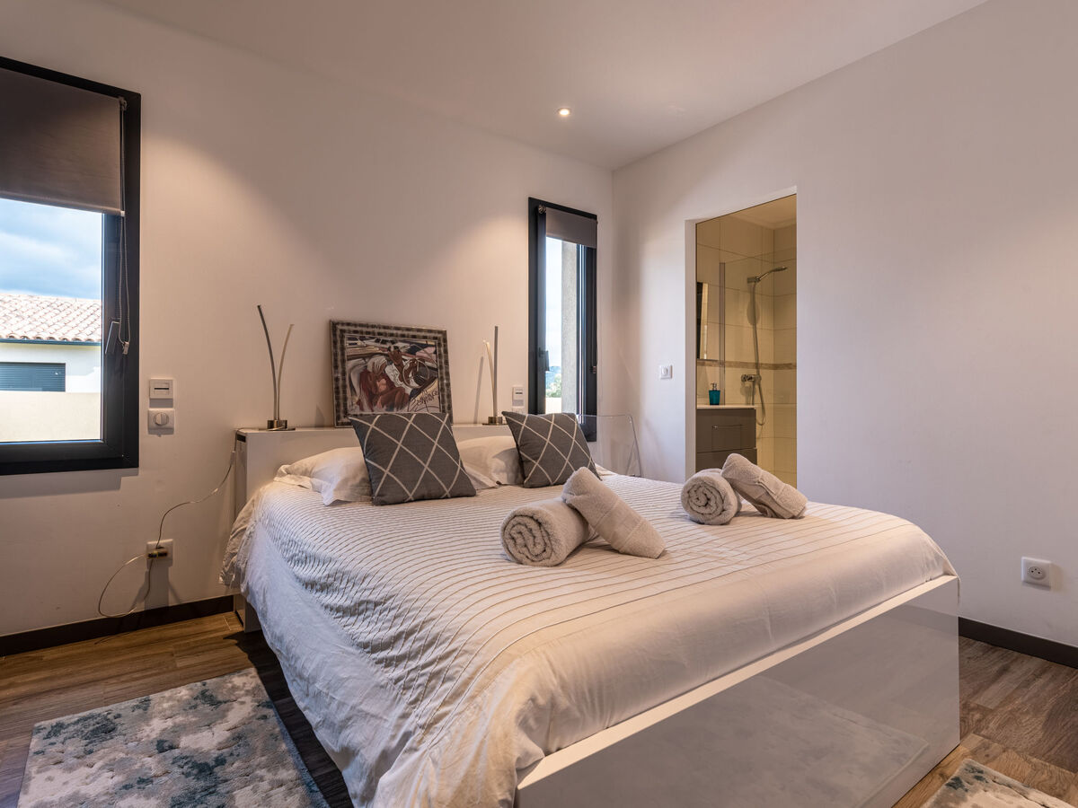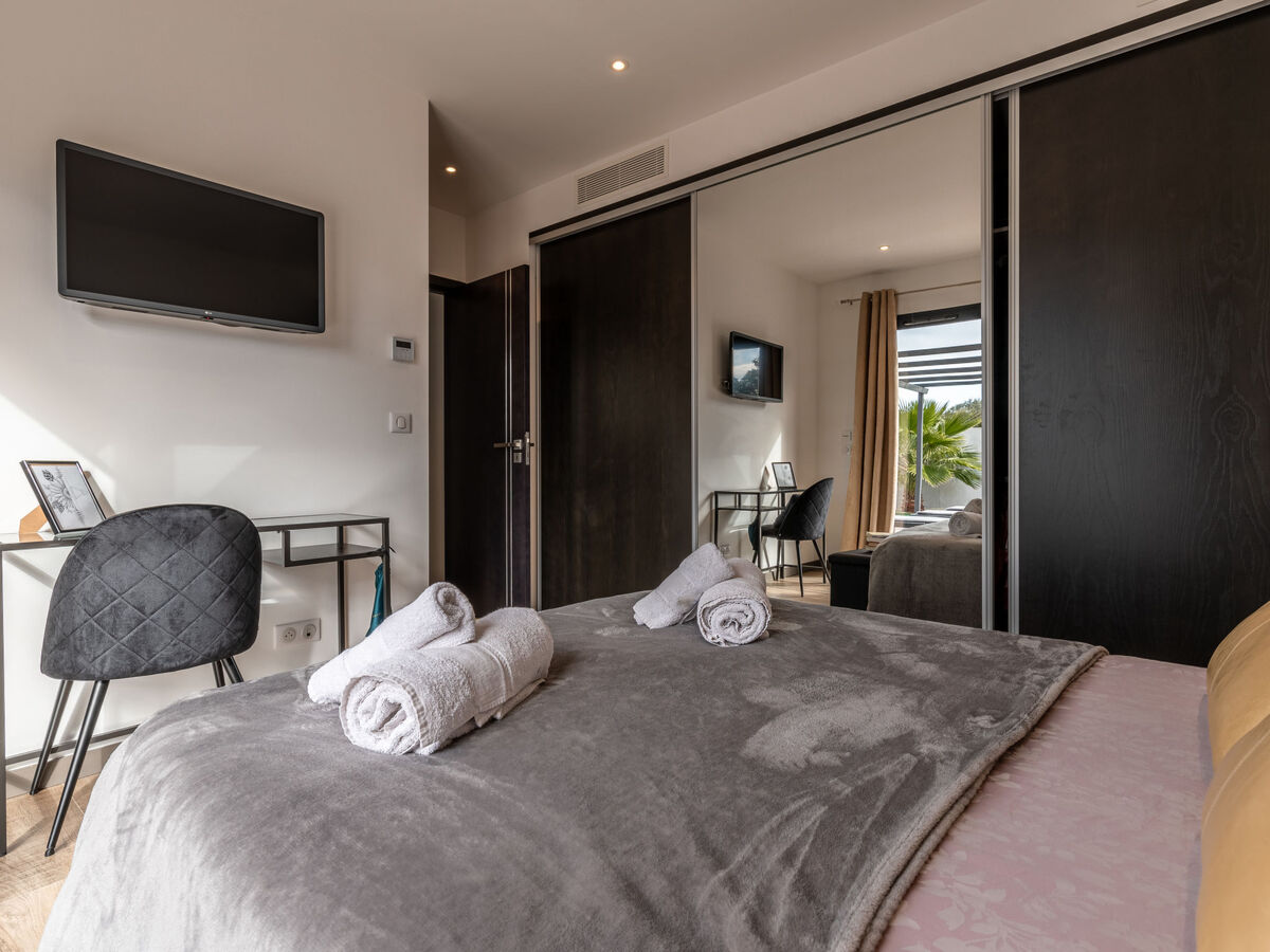 1 chambre avec Dressing avec 1 grand-lit (160 cm, longueur 190 cm), douche/WC et TV (écran plat).