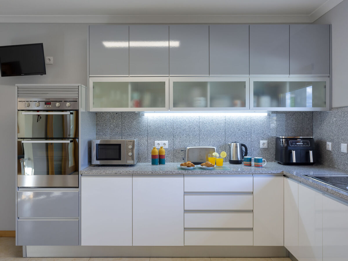 Cuisine ouverte (four, lave-vaisselle, 4 plaques vitrocéramiques, grille-pain, bouilloire électrique, micro-ondes, congélateur, cafetière électrique, Capsules pour machine à café (L'OR PhilipsNot Incl)) avec table pour les repas.