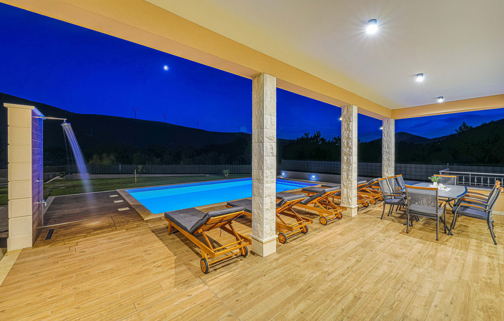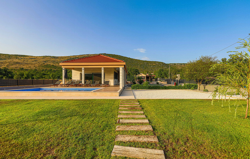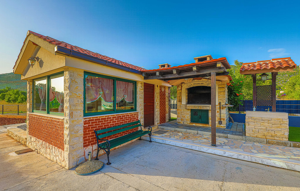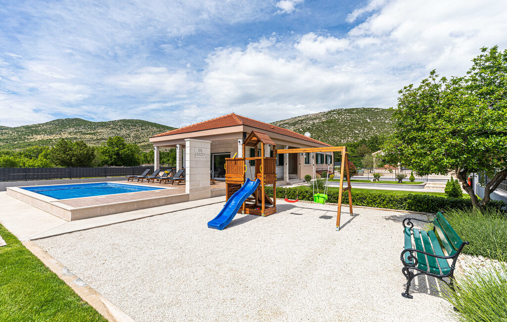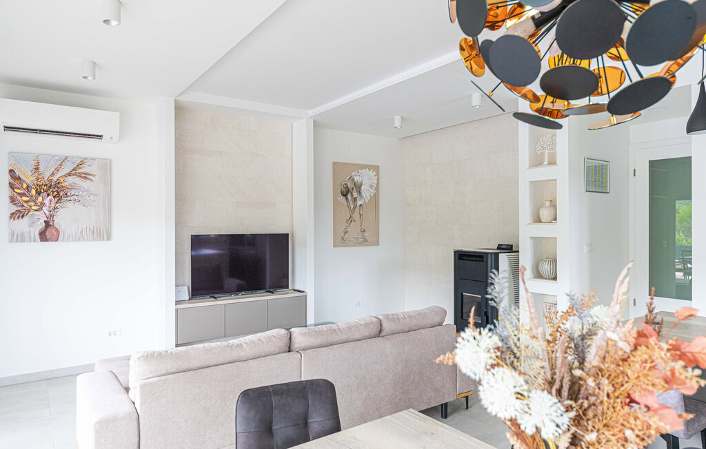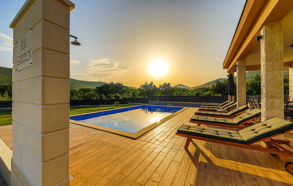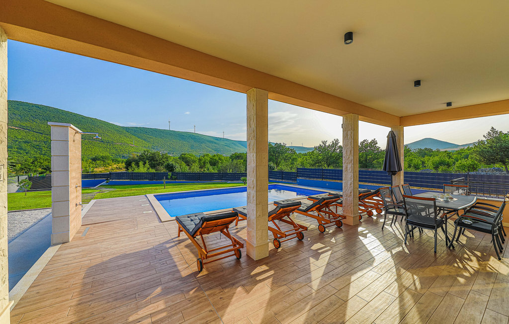 L'espace extérieur attrayant de la maison offre de nombreuses possibilités de passer de bons moments en plein air. Profitez à votre guise du soleil sur les différentes terrasses et rafraîchissez-vous dans la piscine privée avec vue sur les montagnes. Préparez de délicieux plats sur le barbecue et terminez la journée en plein air.