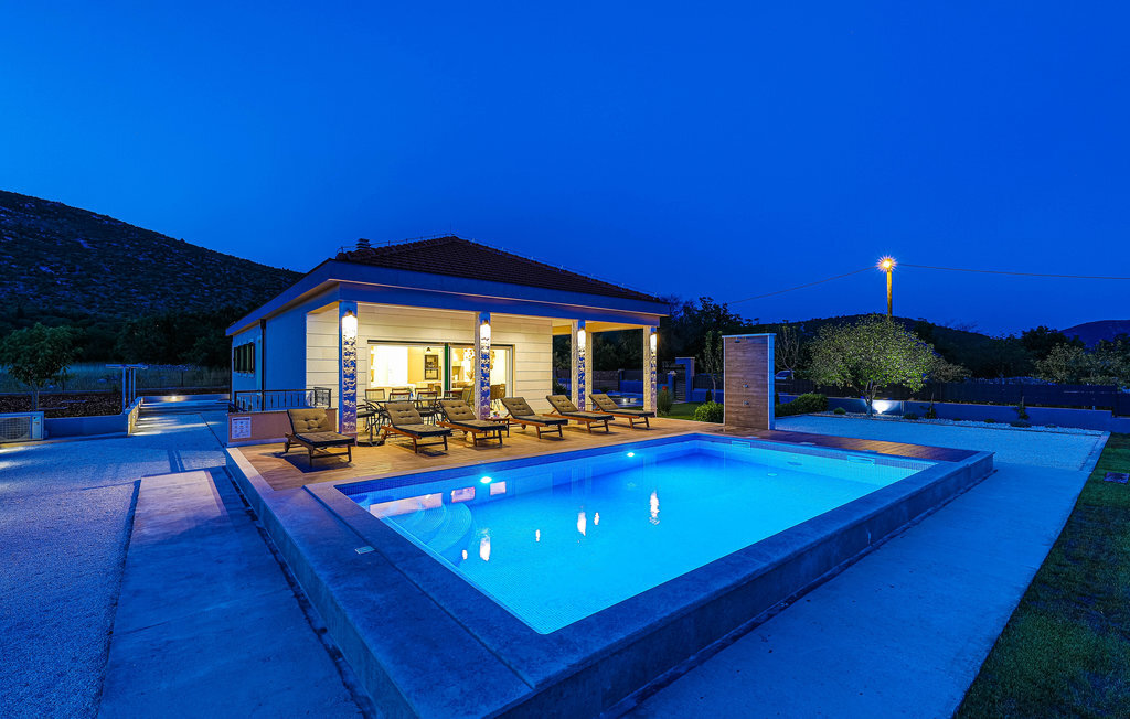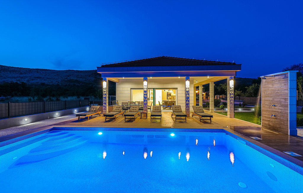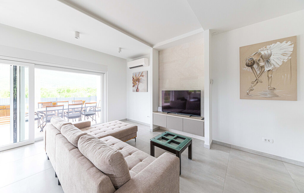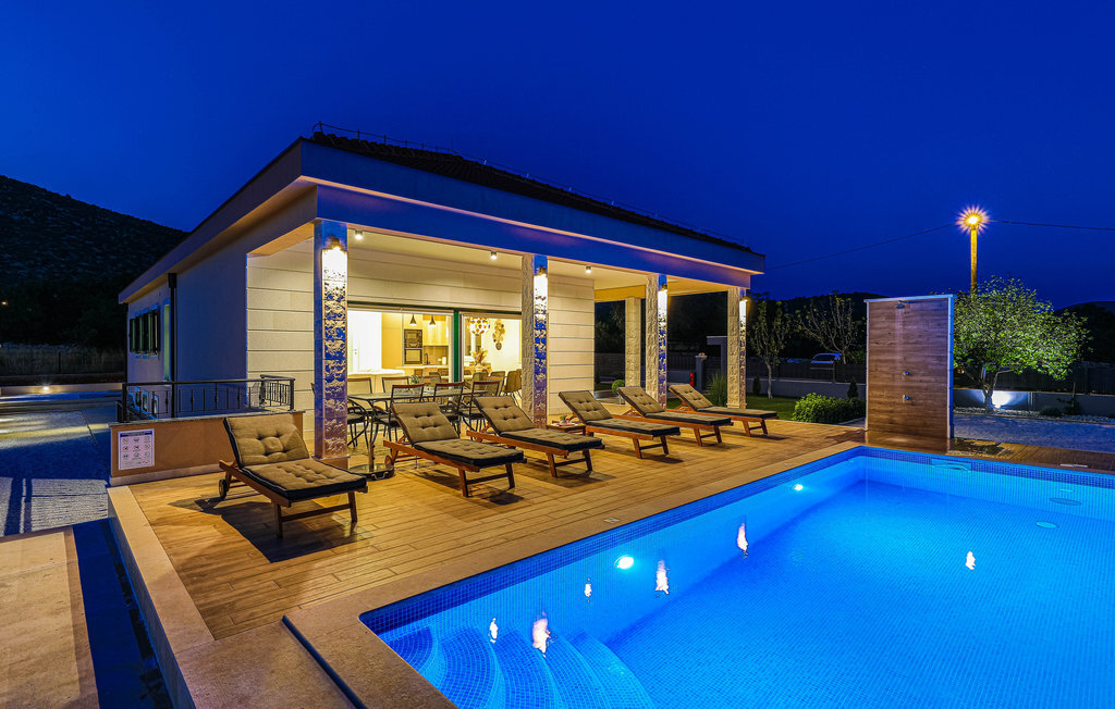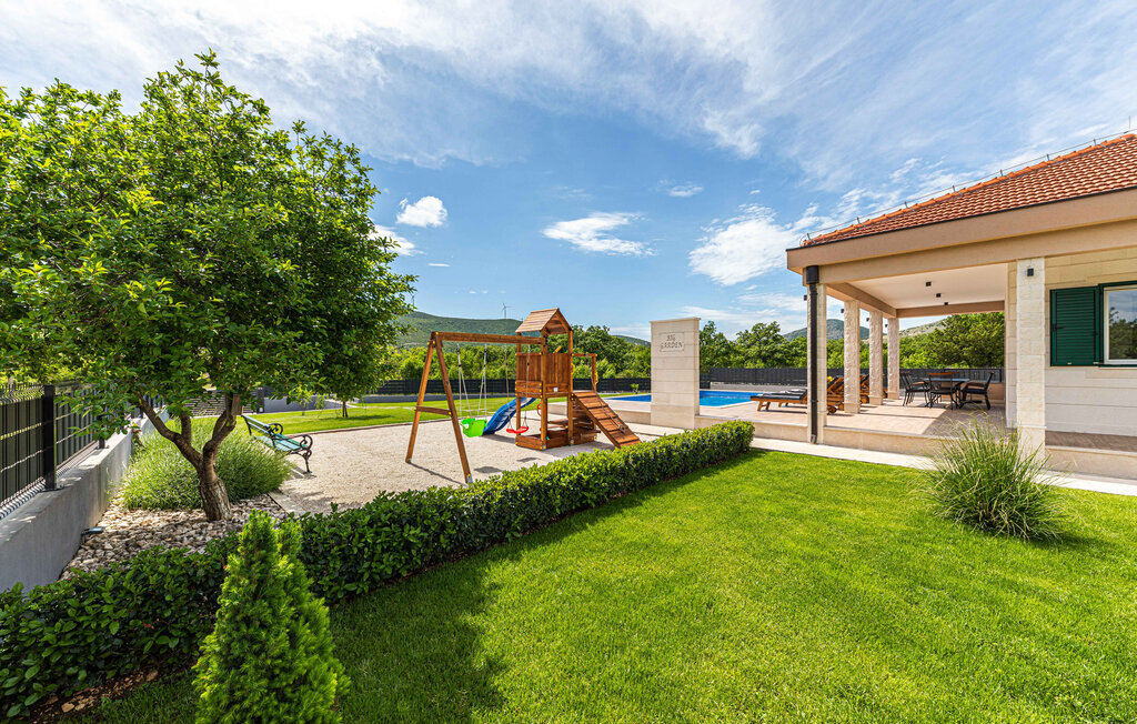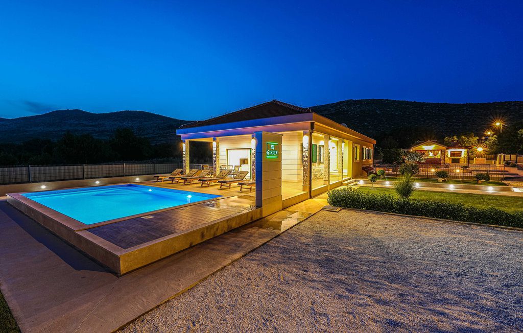 L'espace extérieur attrayant de la maison offre de nombreuses possibilités de passer de bons moments en plein air. Profitez à votre guise du soleil sur les différentes terrasses et rafraîchissez-vous dans la piscine privée avec vue sur les montagnes. Préparez de délicieux plats sur le barbecue et terminez la journée en plein air.