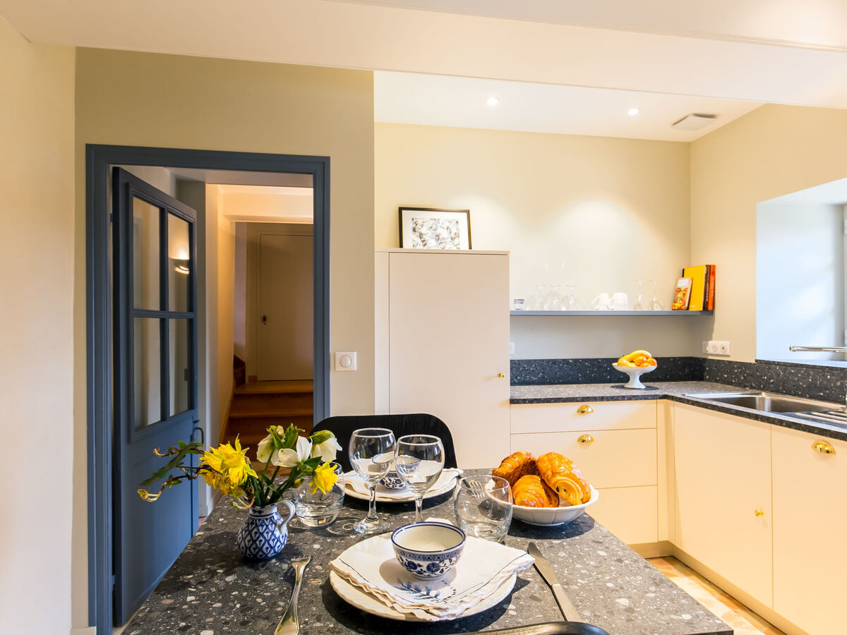 Clair, complètement rénové en 2023, aménagement confortable et romantique: cuisine (four, lave-vaisselle, 4 plaques à induction, grille-pain, bouilloire électrique, micro-ondes, cafetière électrique) avec table pour les repas.