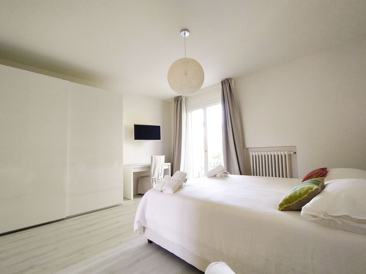 1 grande chambre avec 1 grand-lit (140 cm, longueur 190 cm), douche/bidet/WC et TV (écran plat), air-conditionné.
