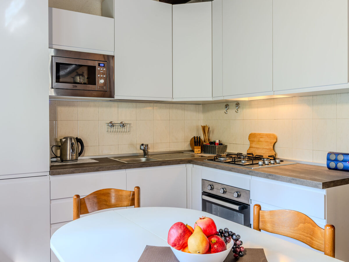 Cuisine ouverte (four, Poêle à gaz, 4 feux, micro-ondes, congélateur) avec bar.