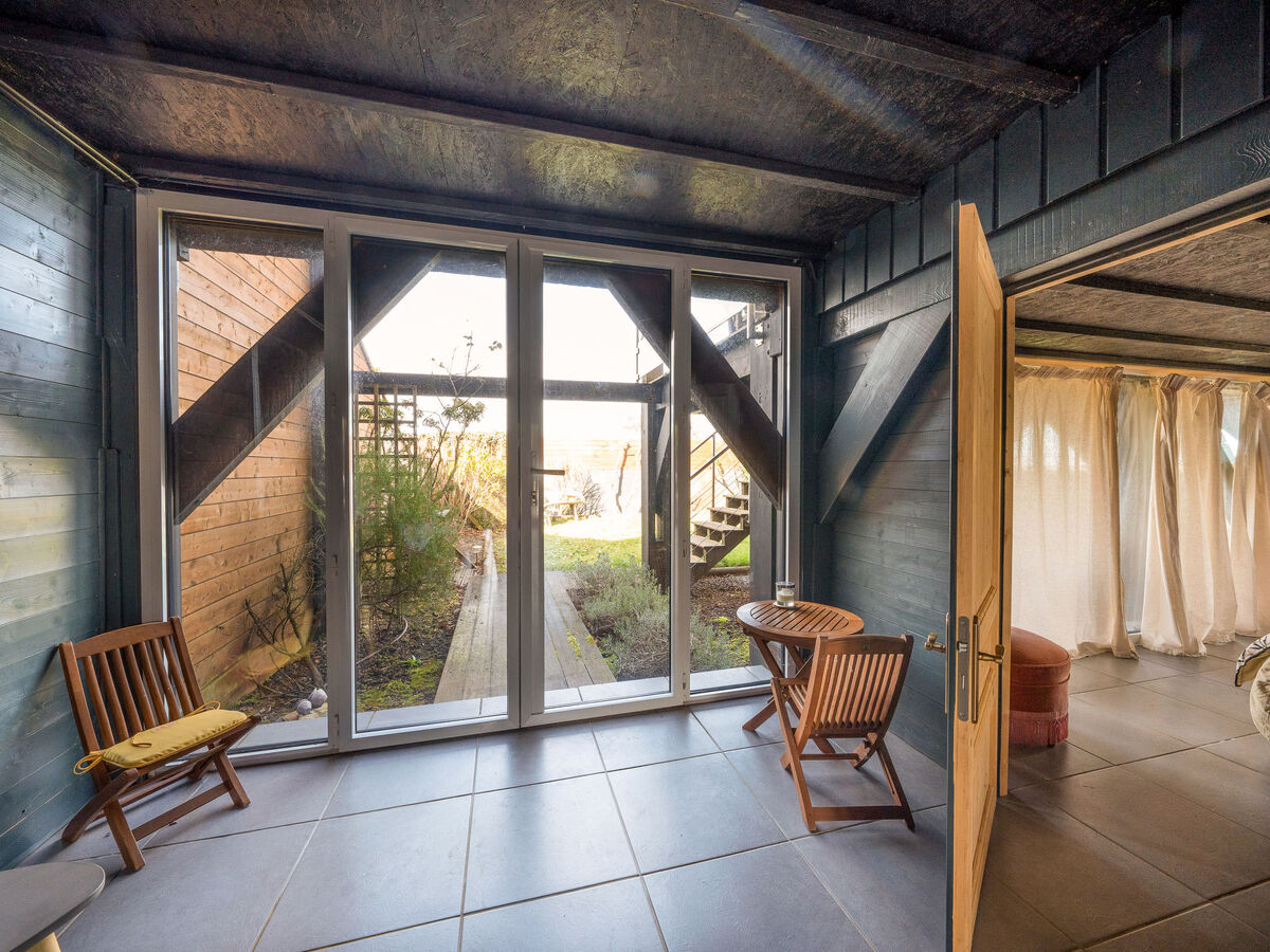 Clair, aménagement confortable et de style: séjour/salle à manger 35 m2 avec baie vitrée orientée nord et orientée sud avec table pour les repas et TV (écran plat), poêle à bois et volet roulant électrique.