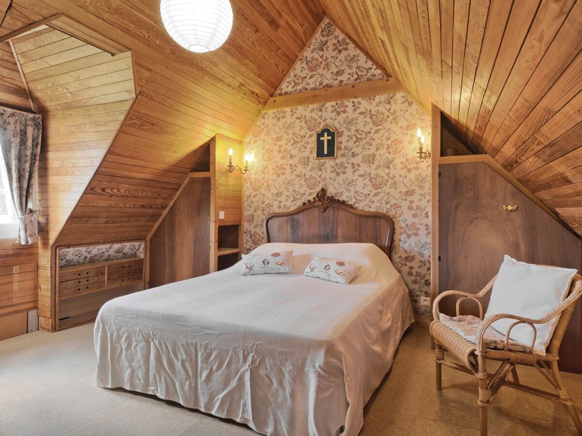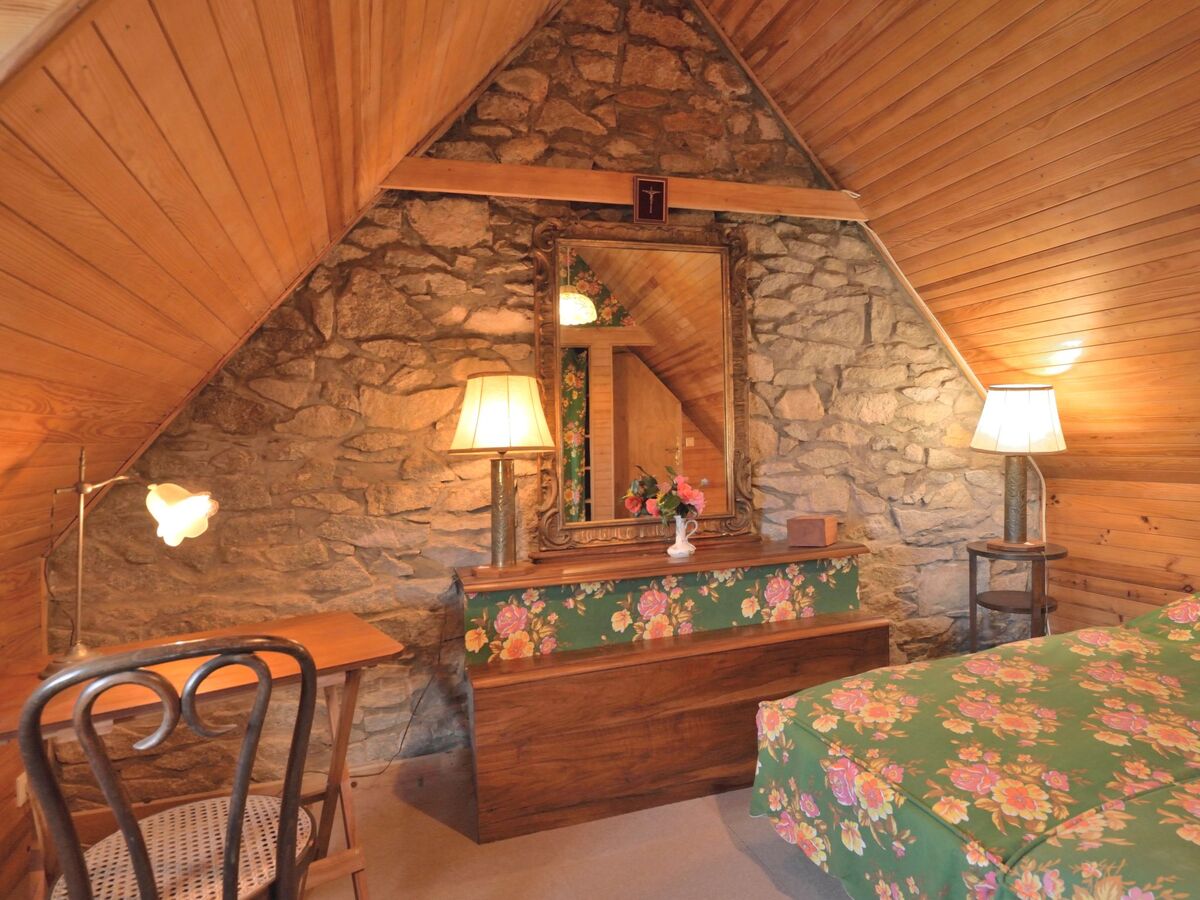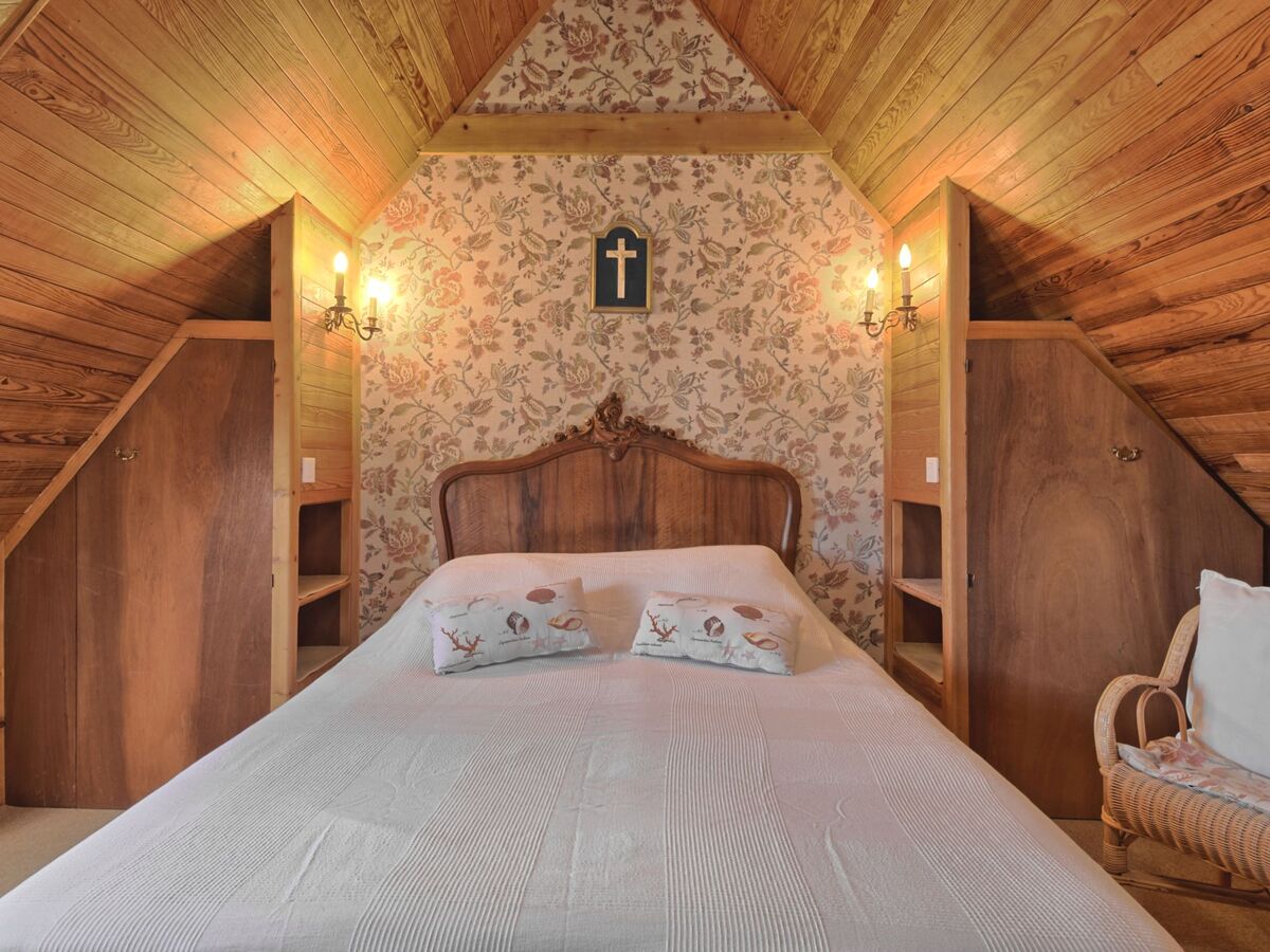 À l'étage supérieur: 1 chambre, mansardée avec 1 grand-lit (160 cm, longueur 200 cm), lavabo.