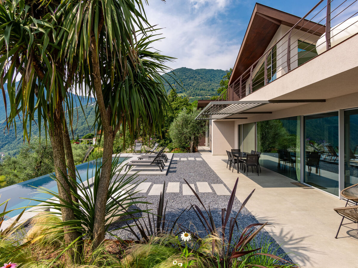 A usage privé: jardin sur plusieurs niveaux 1'000 m2 (pas clôturé) avec pelouse et arbres, piscine à l'abri des regards (11 x 3 m, profondeur 135 - 135 cm, disponibilité saisonnière: 01.Avr.