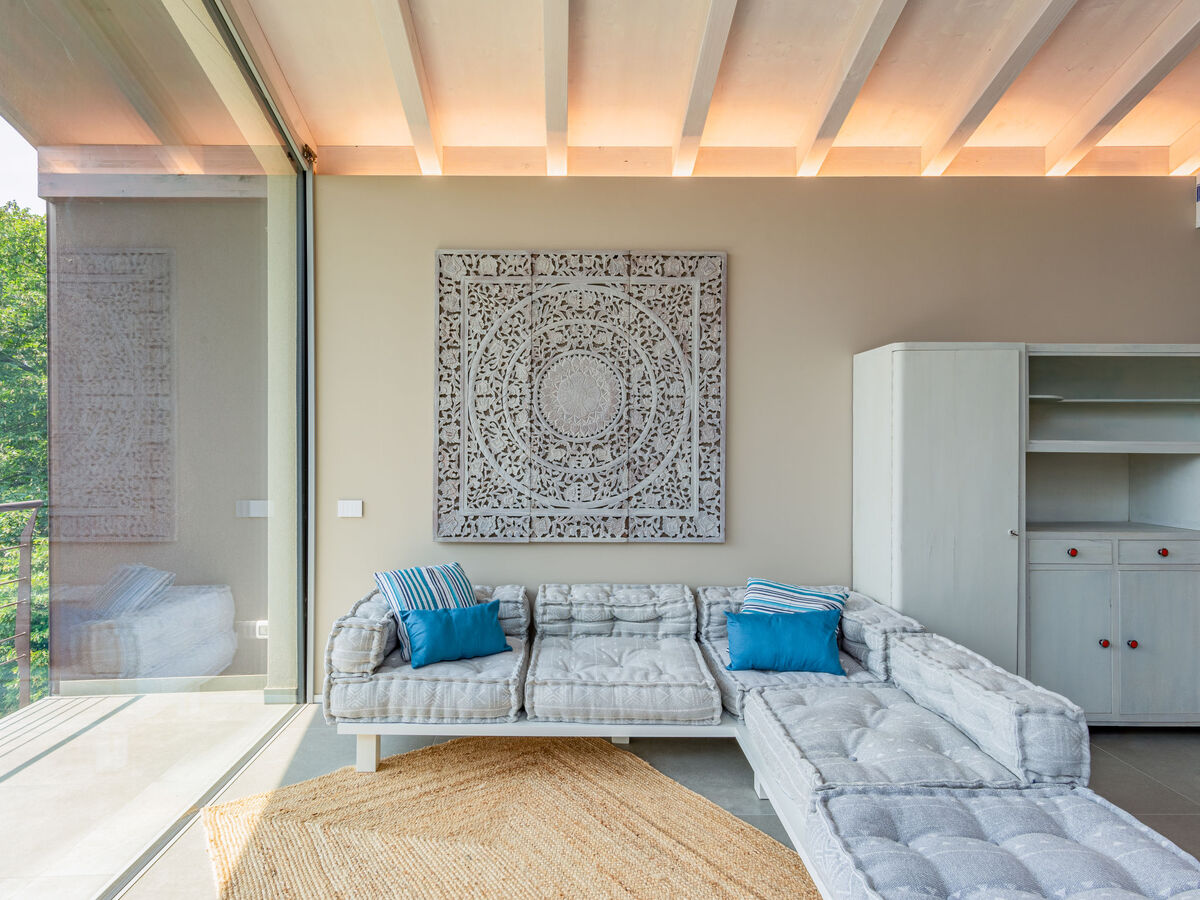 Spacieux et clair, aménagement moderne et de style: grand séjour/salle à manger avec porte coulissante, baie vitrée avec table pour les repas et TV.