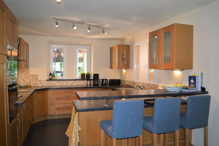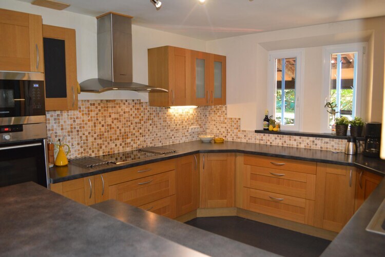 Rez-de-chaussée: (Salle de séjour(TV, table, cheminée, coin salon), cuisine(bouilloire, plaque de cuisson, cafetière/percolateur, four/micro-onde combinés, lave-vaisselle , lavabo)) Au 1er étage: (chambre(lit double, TV), chambre(lit double), chambre(lit double), chambre(lit double), salle de bains(douche, lavabo, WC), salle de bains(douche, lavabo), WC(WC)) table, jardin, transats, barbecue, piscine(privé)